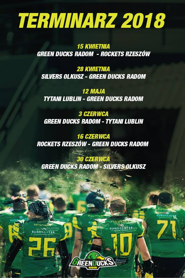Green Ducks rozpoczną rozgrywki domowym meczem z Rzeszów Rockets, który odbędzie się 15 kwietnia. Kolejnym meczem w Radomiu będzie starcie z Tytanami Lublin, trzeciego czerwca. Na naszym terenie odbędzie się także ostatni mecz rundy zasadniczej. Green Ducks 30 czerwca będą gościć Silvers Olkusz.