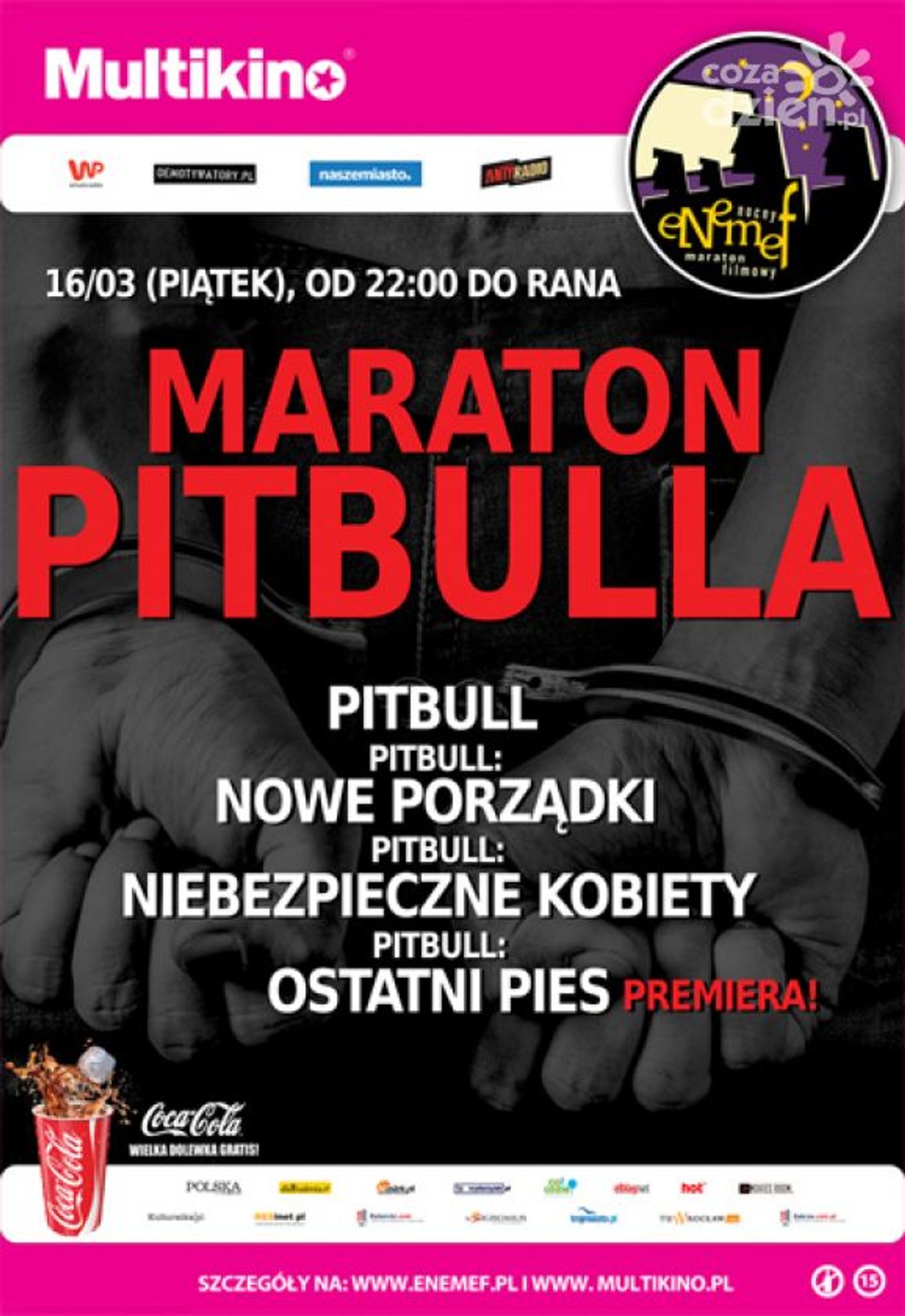 ENEMEF: Maraton Pitbulla to wyjątkowa szansa, aby obejrzeć wszystkie części jednej z najpopularniejszych polskich serii kryminalnych ostatnich lat na wielkim ekranie, w tym najnowszą "Pitbull. Ostatni pies" premierowo! Twarde charaktery, gangsterskie porachunki, policyjne śledztwa, brutalne zbrodnie, a do tego rozbrajający cięty dowcip i fenomenalna obsada aktorska. To wszystko w jedną emocjonującą noc z mocnym i bezwzględnym "Pitbullem". W repertuarze: