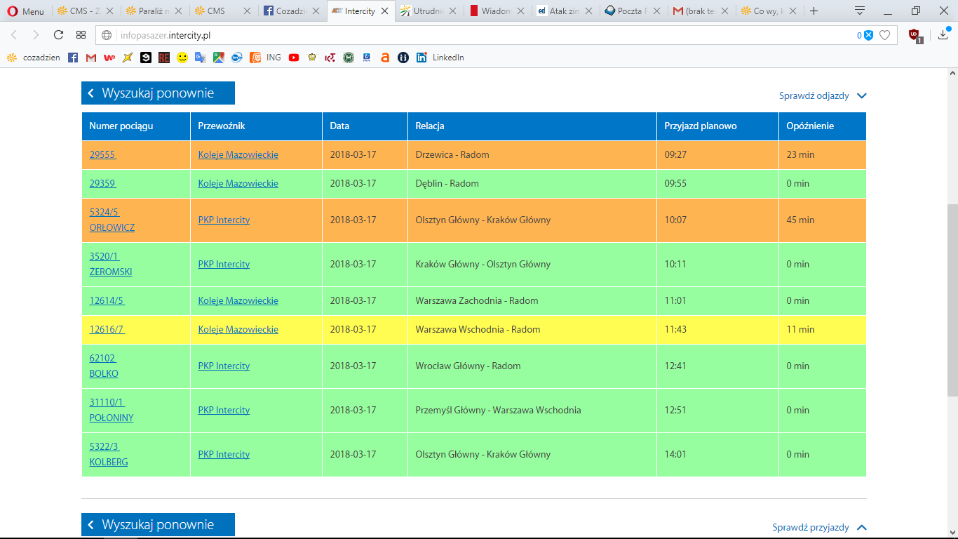Z przyczyn technicznych w dniu dzisiejszym pociąg relacji Warszawa Wschodnia (06:18) - Radom (09:03) jest odwołany. Podróżni zastępczo mogą skorzystać z pociągu "ORŁOWICZ" z Olsztyna Głównego - Warszawa Wschodnia (08:02) - Radom (10:08) - Kraków Główny. Podróżni udający się do stacji pośrednich mogą skorzystać z pociągu Kolei Miejskich relacji Warszawa Zachodnia (08:37) - Radom (11:01).