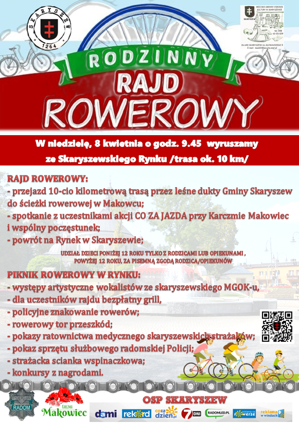 Na uczestników Co Za Jazda! miłe niespodzianki będą czekać już po drodze do Skaryszewa. W Karczmie Makowiec posilą się małym poczęstunkiem - makowcem i napojami. Właśnie tam Co Za Jazda! dołączy do Rodzinnego Rajdu Rowerowego. Po krótkim odpoczynku wszyscy przejadą na rynek w Skaryszewie, gdzie odbędzie się piknik rowerowy.