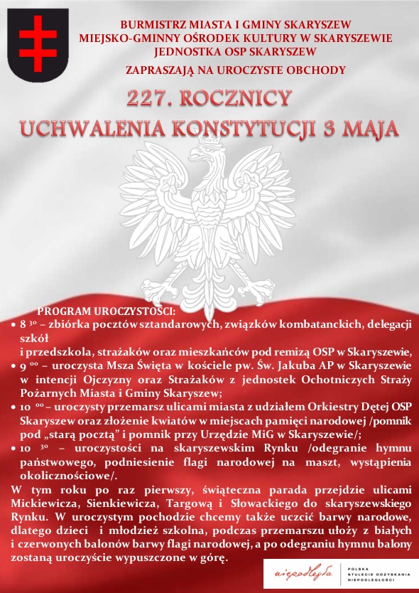 W tym roku, świąteczna parada w asyście Orkiestry Dętej OSP Skaryszew, po raz pierwszy przejdzie ulicami Mickiewicza, Sienkiewicza, Targową i Słowackiego, do skaryszewskiego Rynku. W uroczystym pochodzie chcemy także uczcić barwy narodowe, dlatego dzieci i młodzież szkolna, podczas przemarszu ułoży ze 100 białych i czerwonych balonów barwy flagi narodowej, a po odegraniu hymnu, balony zostaną uroczyście wypuszczone w górę.