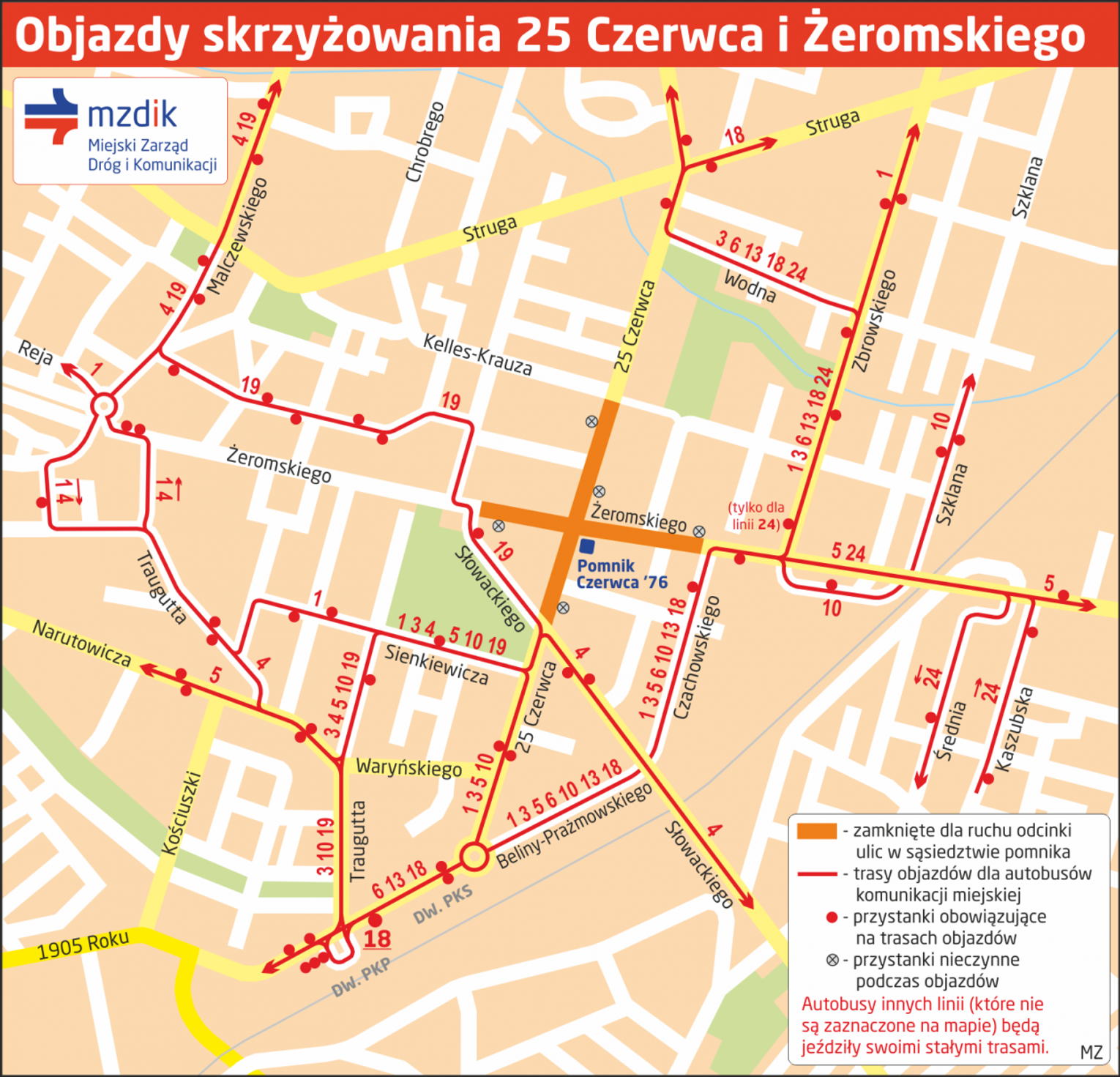 Na trasach objazdów będą obowiązywać wszystkie przystanki. Uruchomione zostaną ponadto przystanki tymczasowe: Czachowskiego / Żeromskiego 01 (dla linii 1, 3, 5, 6, 10, 13, 18) i Zbrowskiego / Żeromskiego 09 (tylko dla linii 24). Nieczynne będą przystanki: Żeromskiego / Czachowskiego 05 (w stronę 25 Czerwca), 25 Czerwca / Kaufland 04, 25 Czerwca / Skłodowskiej-Curie 03 i 06 oraz Żeromskiego / Słowackiego 02. Autobusy mogą jeździć z kilkuminutowymi opóźnieniami.
