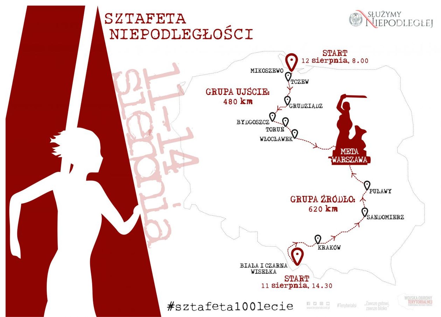 Sztafeta odbędzie się w dniach 11-14 sierpnia br., w przededniu Święta Wojska Polskiego, wpisując się w obchody setnej rocznicy odzyskania niepodległości. Uczestnikami będą żołnierze i pracownicy WOT, którzy zostaną podzieleni na dwie grupy: ŹRÓDŁO i UJŚCIE.