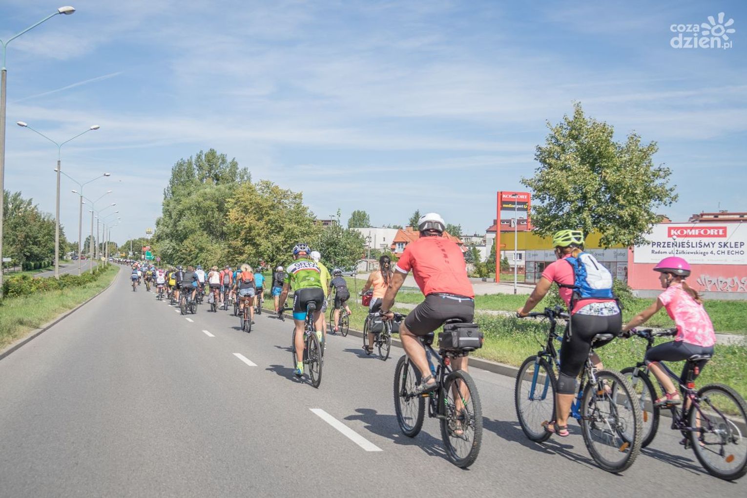 W niedzielę, 12 sierpnia na parkingu pod supermarketem Piotr i Paweł, przy Grzecznarowskiego zgromadzili się uczestnicy sierpniowej wyprawy rowerowej z cyklu Co Za Jazda! Do pokonania tym razem była trasa licząca blisko 50 kilometrów. Rowerzyści wyruszyli ulicą Grzecznarowskiego, następnie przez ulicę Kościuszki do Narutowicza. Z ulicy Narutowicza uczestnicy wyprawy przejechali przez Limanowskiego do Okulickiego i prosto do ulicy Zielonej, w kierunku Janiszewa. Minęli Dąbrówkę Nagórną i Dąbrówkę Podłężną. Potem przy tablicy z napisem „Gózdek” skręcili w lewo, w kierunku Radomki. Tam na rowerzystów czekała przeprawa przez rzekę. - W tym miejscu nie ma drogowego mostu. Są za to płyty betonowe ułożone na dnie Radomki. To prowizoryczny, rolniczy przejazd z którego - sądząc po śladach - korzystają też samochody osobowe. Głębokość brodu w tym miejscu to ok. 20 cm, więc spokojnie przejedziemy na rowerze. Czyniłem to wielokrotnie - frajda jest ogromna - mówił Paweł Szerszeń, autor bloga „Rowerem za grosze”, który przygotowuje trasy naszych wycieczek z cyklu Co Za Jazda!. Alternatywą dla niezdecydowanych była mała kładka znajdująca się około 100 m w górę rzeki. Po przeprawie, uczestnicy wycieczki udali się w kierunku Ludwikowa. Następnie trasa prowadziła na drogę łączącą Starą Błotnicę z międzynarodową trasą E77. W Starej Błotnicy, przy kościele Narodzenia Najświętszej Maryi Panny, gdzie 21 sierpnia 1977 roku, podczas koronacji cudownego obrazu Matki Bożej Pocieszenia, tutejszą parafię odwiedził ówczesny kardynał i metropolita krakowski Karol Wojtyła, uczestnicy wyprawy mieli chwilę na odpoczynek. Po zregenerowaniu sił, rowerzyści wyruszyli prosto do Białobrzegów. Na białobrzeskim rynku była meta, na której tradycyjnie czekała woda oraz kiełbaski z grilla. - Ta wyprawa była wyjątkowa. Na trasie były niespodzianki m.in. przeprawa przez rzekę Radomkę. Było dużo zabawy, dużo ciekawych rzeczy się działo, wywrotki, niektórzy doznali kąpieli w rzece. Bardzo fajna trasa. Jak zwykle ciekawa, urozmaicona, dobre humory, wysoka frekwencja. Jesteśmy bardzo zadowoleni - mówił na mecie wyprawy Stefan Tatarek, prezes Radia Rekord. Kolejna wyprawa rowerowa z cyklu Co Za Jazda! w drugą niedzielę września