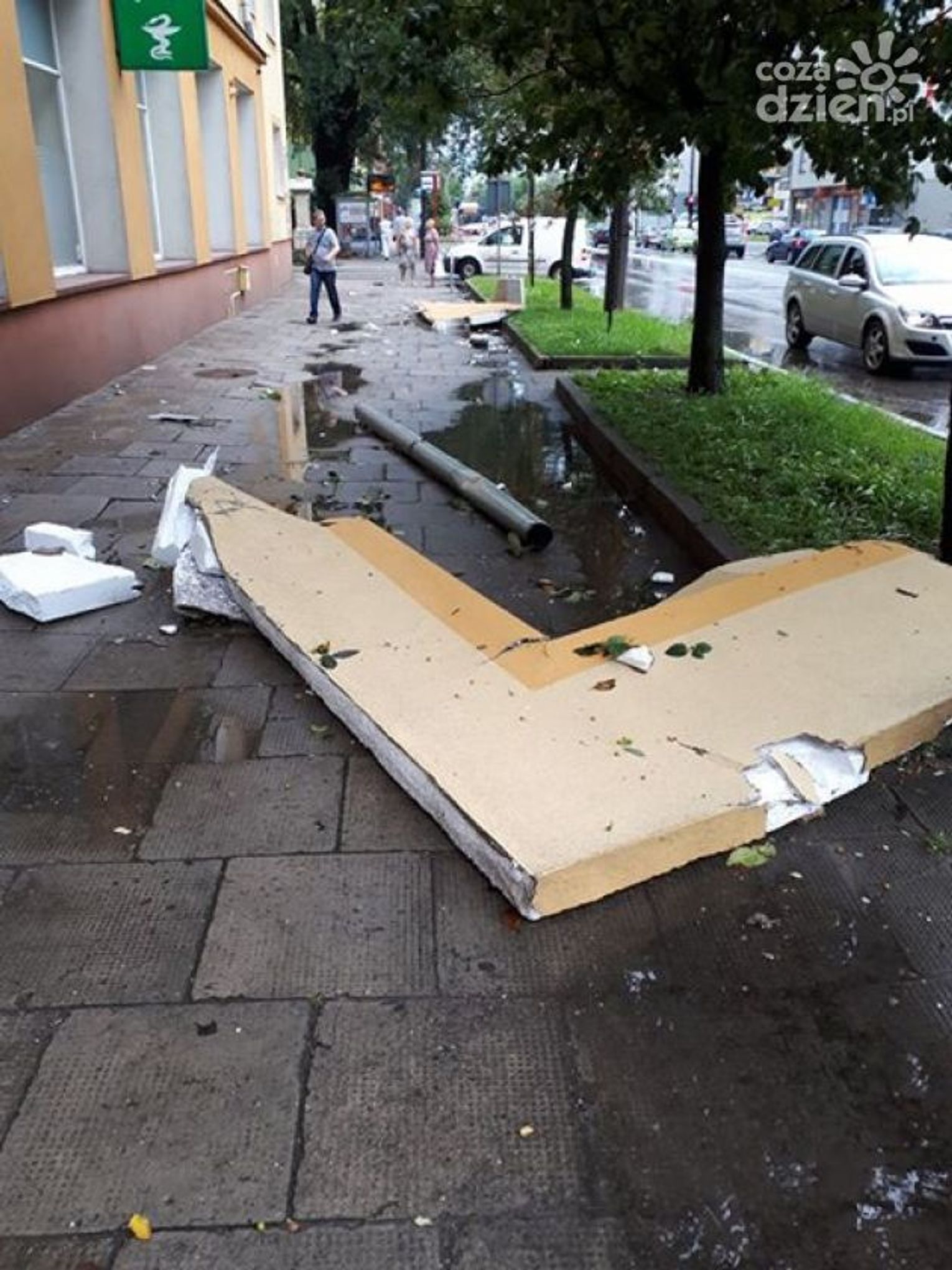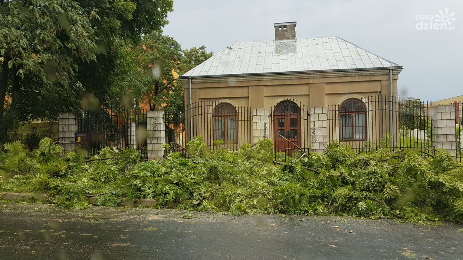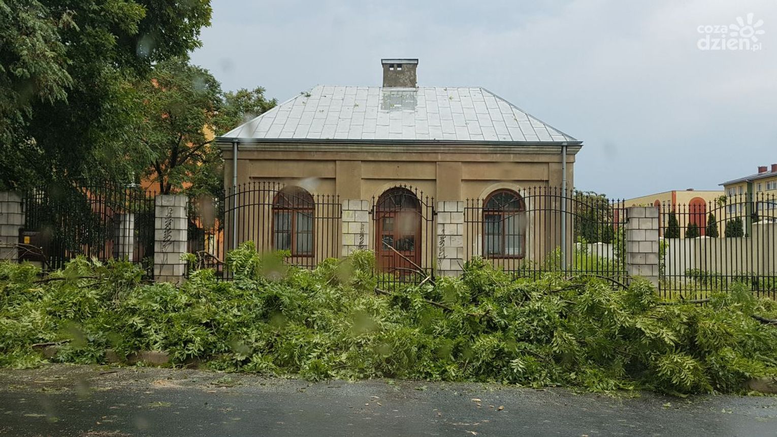 Uszkodzony został również płot przy budowie Placu Jagiellońskiego. Wyrwane drzewo przy Domu Pomocy Społecznej przy ul. Struga 88 zatarasowało wjazd do placówki. Przy ul. Żeromskiego, w okolicach przystanku Żeromskiego/Czachowskiego burza uszkodziła elewację budynku. Przy ul. Zakrzewskiej wiatr zerwał dach jednego z domów. Dachy ucierpiały też w okolicach Radomia - m.in. w Strzałkowie i w Ślepowronie.