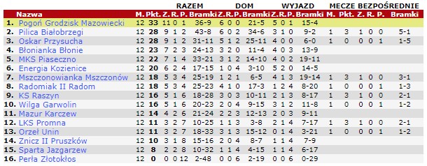 Niespodziewaną porażkę ponieśli piłkarze Pilicy Białobrzegi. Mszczonowianka, prowadzona przez byłego trenera Pilicy, Macieja Śliwowskiego, wygrała 3:0 i przeważała przez całe spotkanie. Przyjezdni strzelili gola "do szatni", a w drugiej połowie dobili białobrzeżan. Wicelider odpowiedział tylko jednym golem, Marcina Rawskiego z rzutu karnego. Pilica traci już pięć punktów do lidera z Grodziska Mazowieckiego.