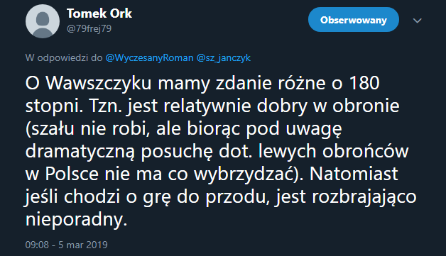 Dotychczas Wawszczyk nie zaznaczał swojej obecności w ofensywie aż tak mocno. Miał też cztery asysty drugiego stopnia, ale więcej bramek wypracował dla zespołu jego vis-a-vis, Damian Jakubik. Pod jednym z moich tweetów wytknął to pewien internauta, pod nickiem Tomek Ork.