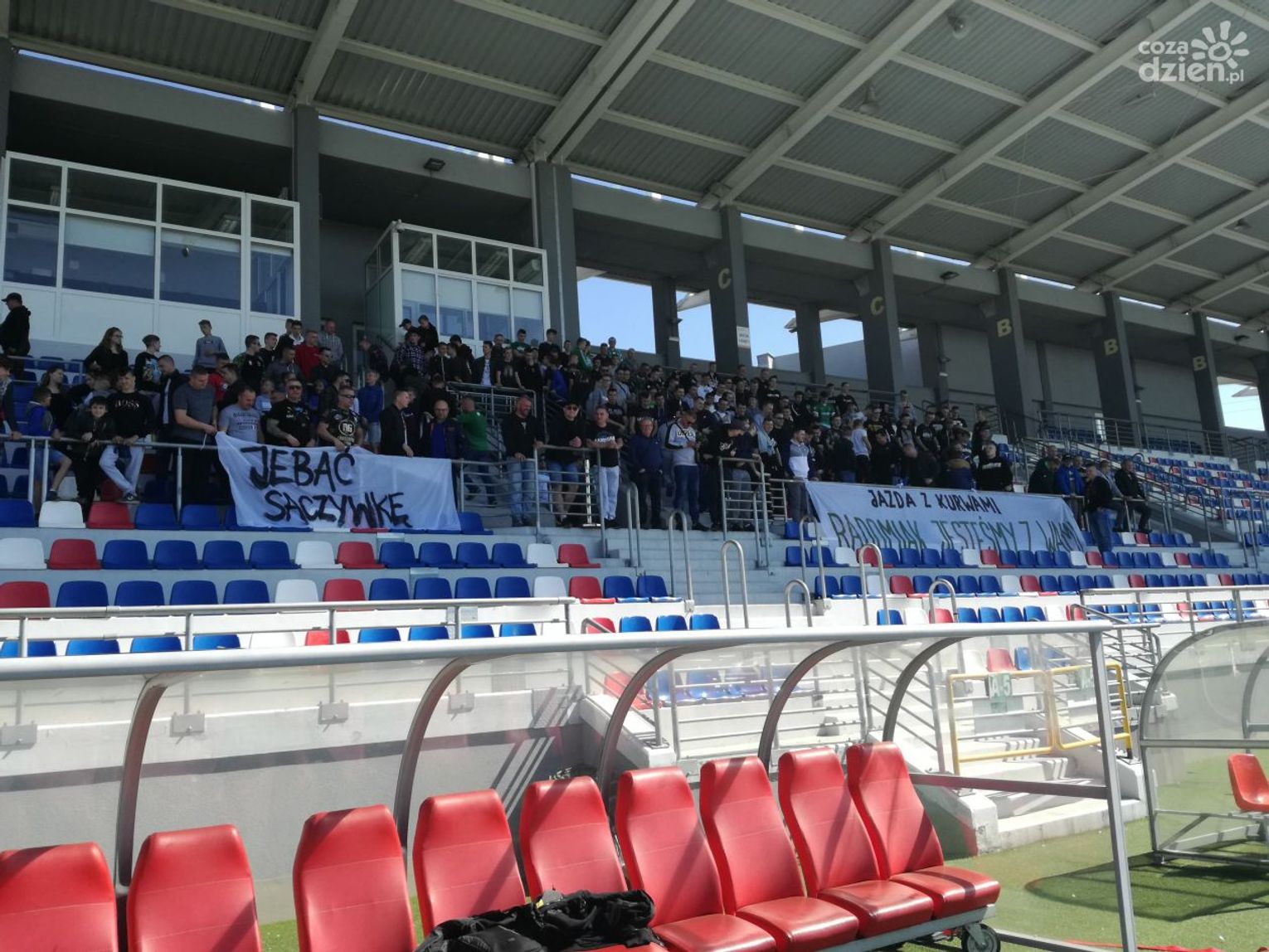 Kiedy na murawie stadionu pojawili się piłkarze, kibice zaintonowali kilka dobrze znanych przyśpiewek. "Jesteśmy z wami", "tylko zwycięstwo", czy też mniej nadające się do pełnego zacytowania "jazda z kur.." i "nie ma litości..." niosło się po stadionie MOSiR-u. Treningową oprawę uzupełniła pirotechnika i dwa, widoczne na zdjęciu, transparenty. Piłkarze podziękowali kibicom brawami i skupili się na zajęciach pod okiem trenera Dariusza Banasika.