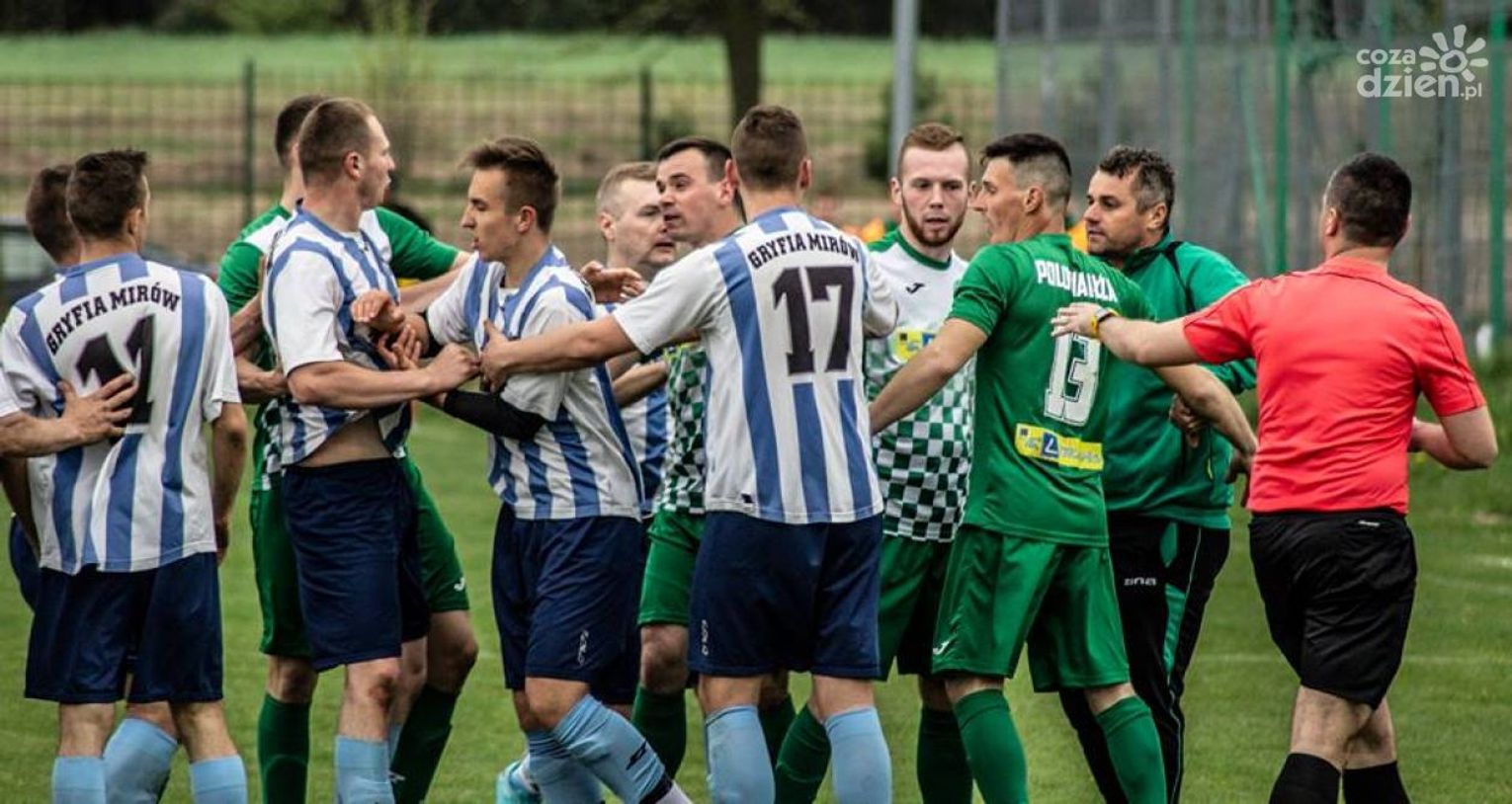 W 19. kolejce Pineks Klasy A Gryfia Mirów podejmowała Polonię Iłża. Gospodarzom nie szło najlepiej - przegrali ten mecz 1:6. Przy wyniku 1:5 frustracja wzięła górę, a na boisku wywiązała się awantura. Po faulu Piotra Gałczyńskiego (Polonia) na Damianie Grzmilu (Gryf), poszkodowany zdecydował się wymierzyć sprawiedliwość sprawcy i go spoliczkować. - By rozdzielić obu podbiegli Iwan Dynya i Patryk Kiełbasa. Wywiązała się przepychanka, do której dołączyli wszyscy gracze obu drużyn - czytamy na oficjalnej stronie iłżeckiego klubu.