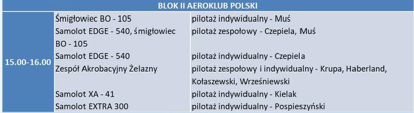 Występy w powietrzu rozpoczną się o godzinie 9, a zakończą ok. godz. 19. W pokazach wystąpią zespoły akrobacyjne: Biało-Czerowne Iskry, Orlik oraz Baltic Bees, grupy lotnictwa cywilnego m.in. Red Bull - The Flying Bulls, Cellfast Flying Team, Formation Flying Team, grupa Żelazny.