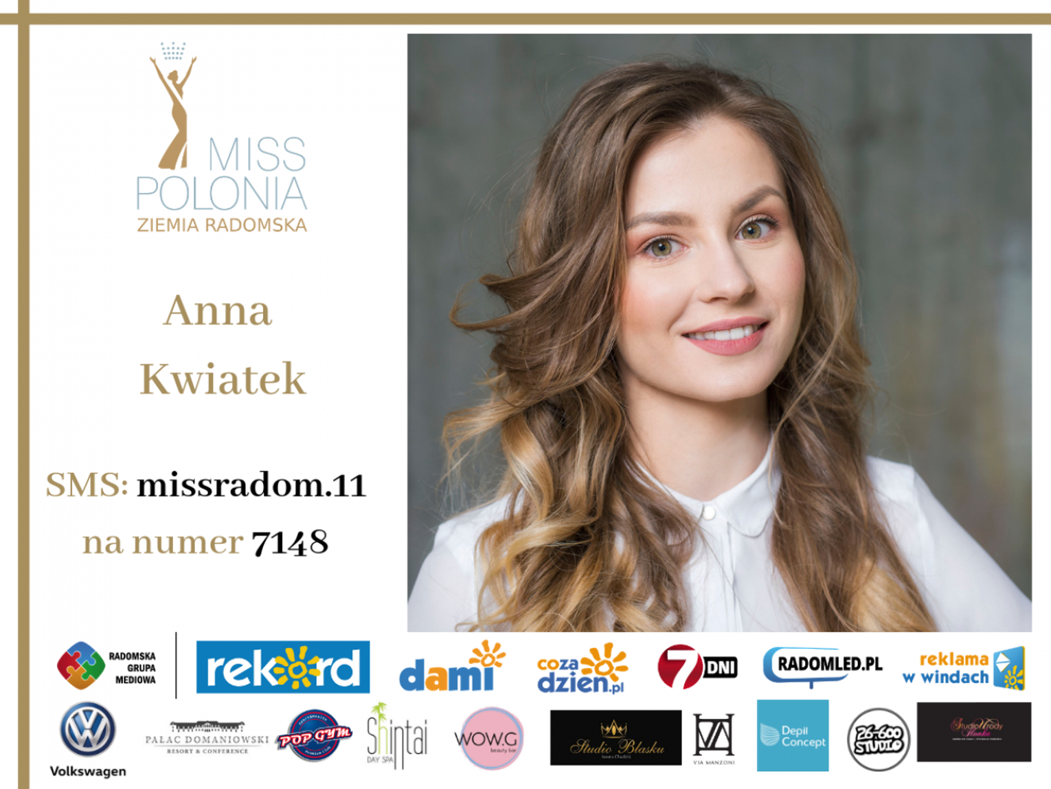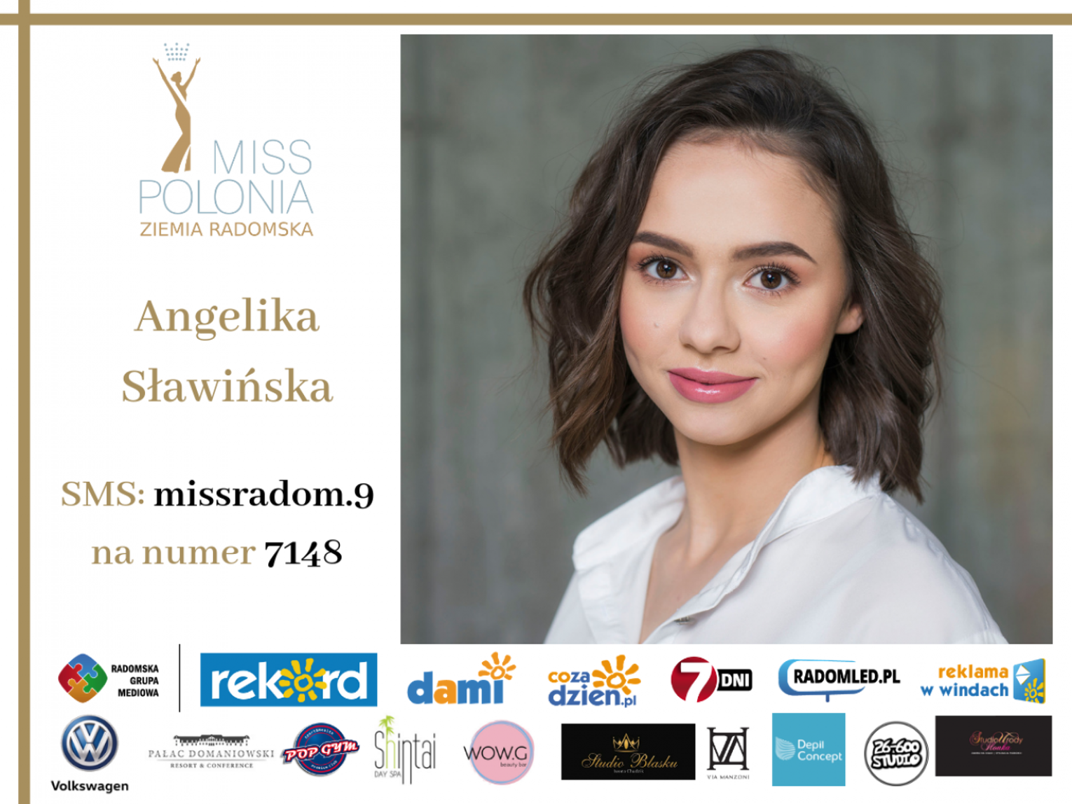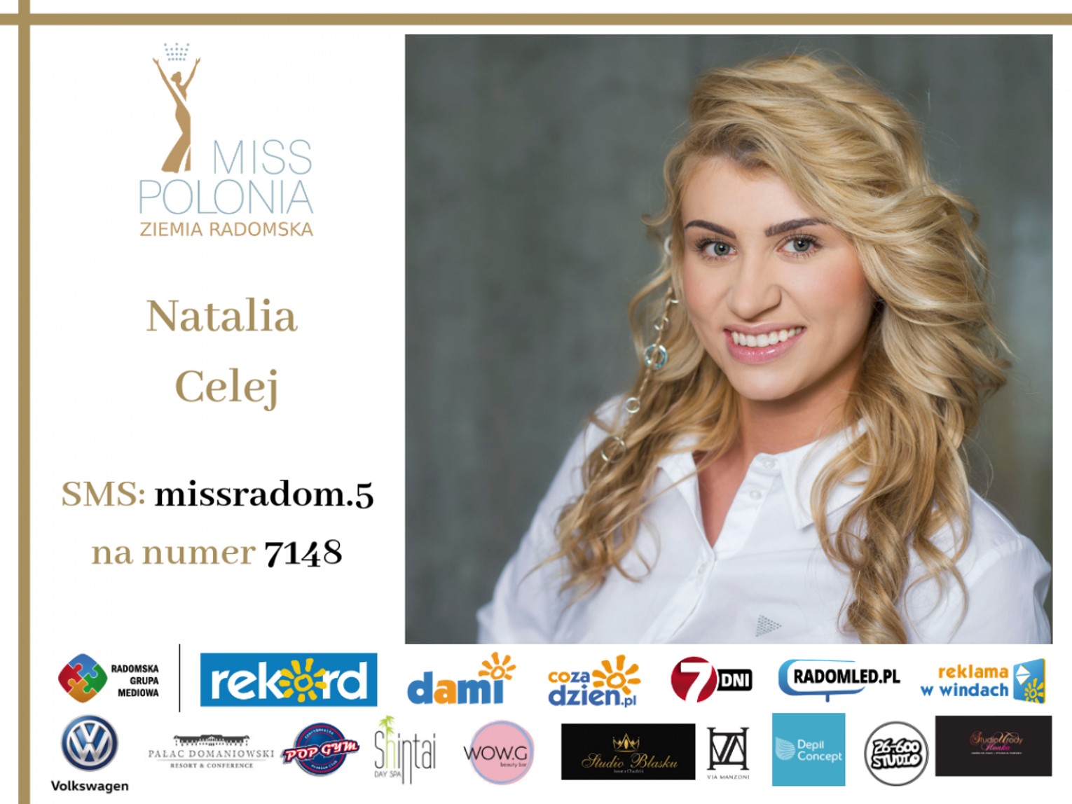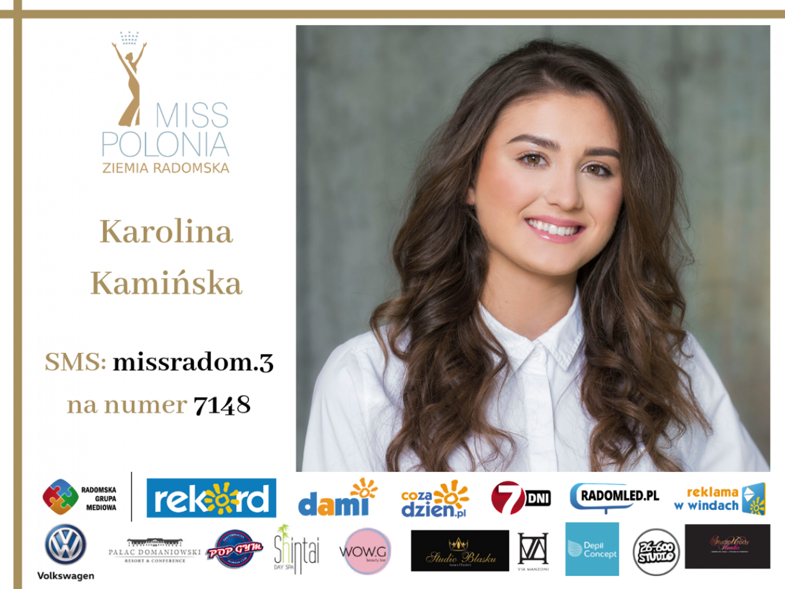 Wybór na Miss Publiczności plebiscytu Miss Polonia 2019 - Ziemia Radomska trwa od 14 maja do 18 czerwca do godz. 19. Wyniki zostaną ogłoszone podczas gali finałowej. Żeby zagłosować na kandydatkę należy wysłać SMS o treści misspolonia.numerkandydatki na nr 7148 koszt za jednego SMS-a to 1,23 zł z VAT.