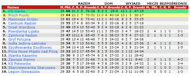Nieporadność Prochu wykorzystał klub z Warki, choć w starciu z Jodłą to klub z Jedlni-Letnisko szybko objął prowadzenie. Dwa gole w siedem minut, trzeci po krótkiej przerwie i walcząca o awans Warka wpadła w spore kłopoty. Druga połowa była jednak nieco lepsza w wykonaniu przyjezdnych. Efektem tego było dziewięć goli w meczu i zmiana na pierwszym miejscu. Warto też dodać efektowne zwycięstwo KS Potworów, który w meczu o utrzymanie grał z Legionem Głowaczów.