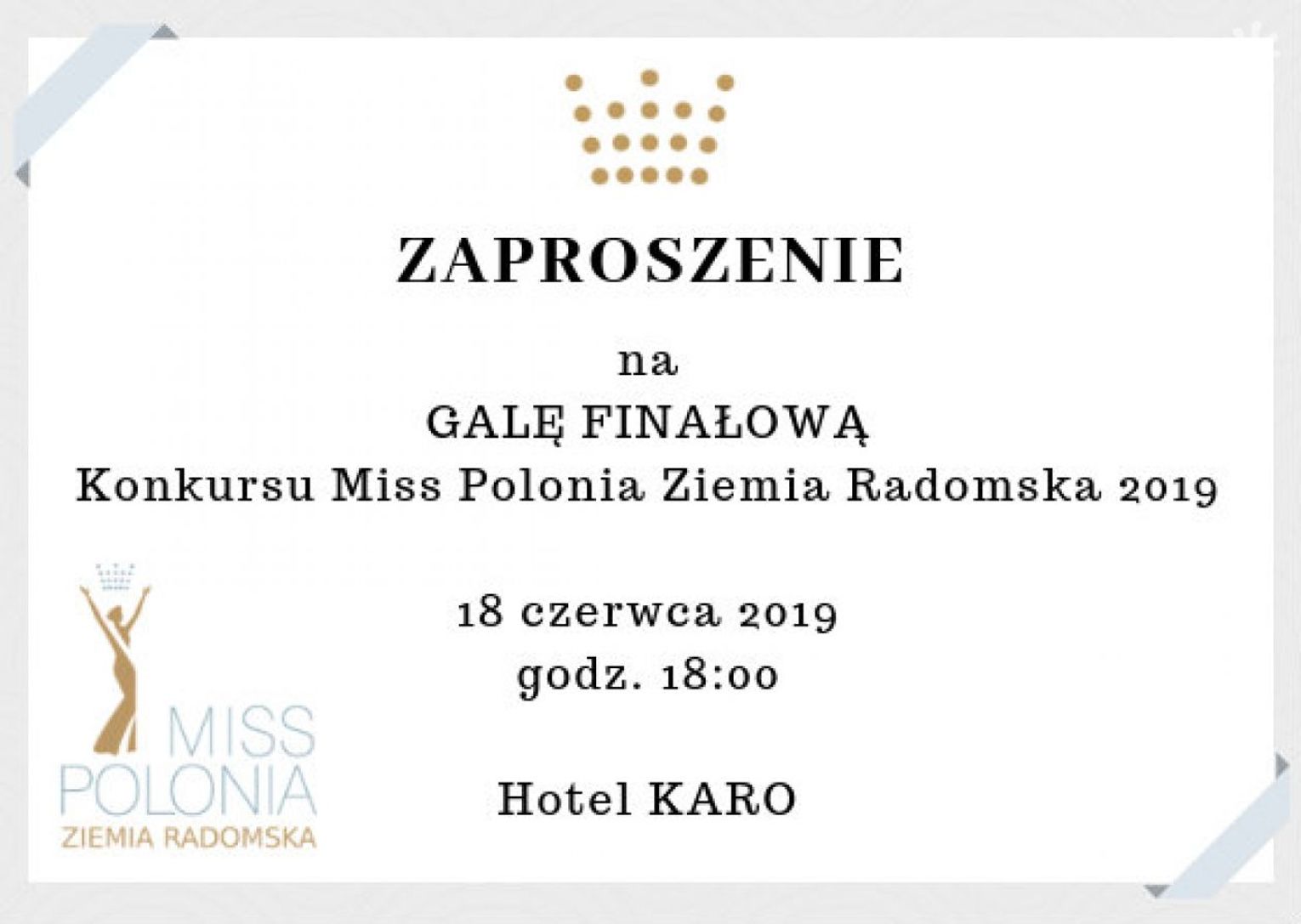 Transmisja gali finałowej Miss Polonia – Ziemia Radomska 2019 odbędzie się za pośrednictwem Telewizji Dami na kanale 140 w sieci kablowej Vectra oraz na portalu CoZaDzien.pl. Na transmisję zaprasza RTBS Administrator.