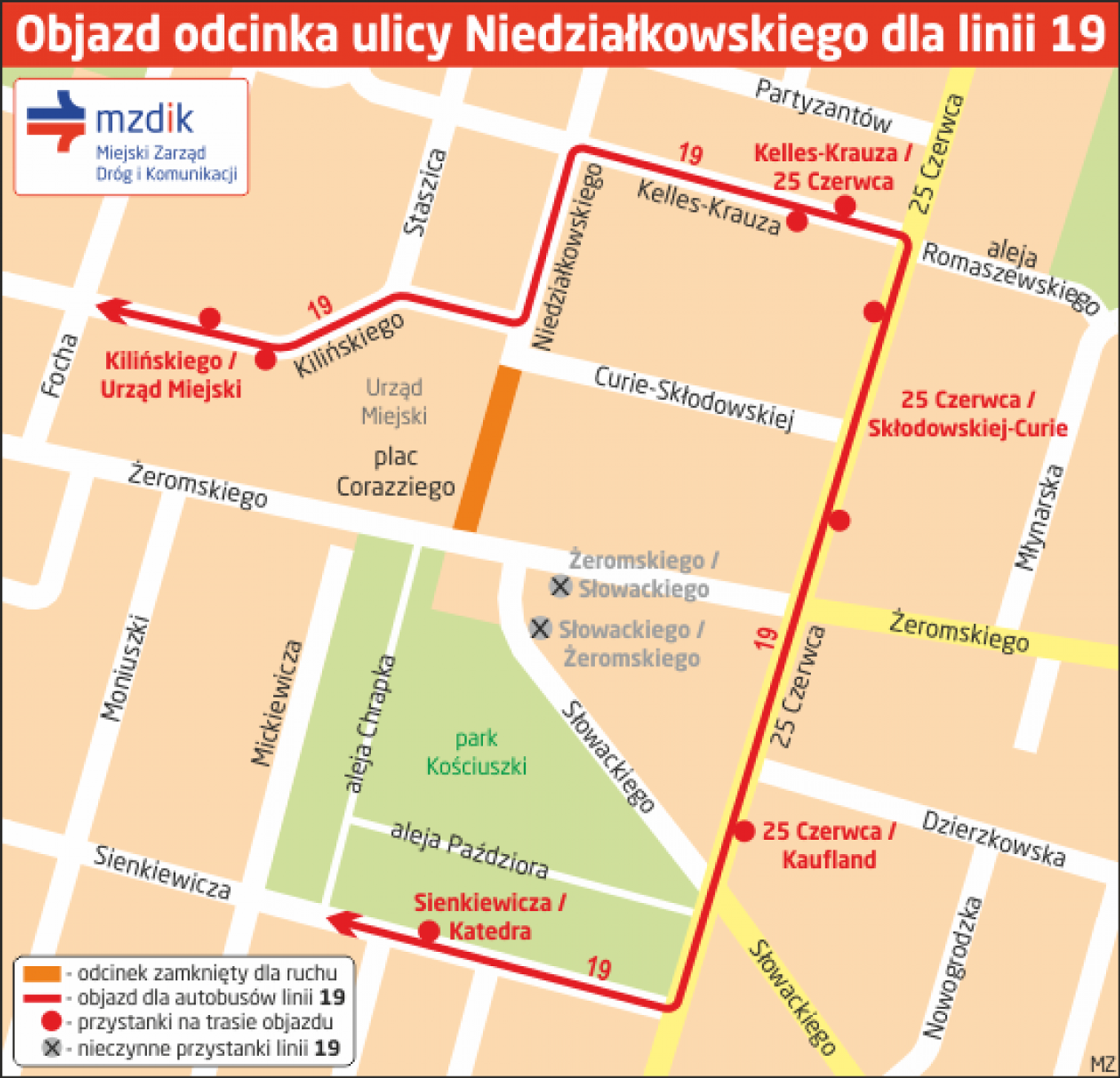 Na trasie objazdowej dla linii 19 będą obowiązywały wszystkie stałe przystanki. Nieczynne będą wtedy przystanki Słowackiego / Żeromskiego 01 (w kierunku Żeromskiego) i Żeromskiego / Słowackiego 02 (w kierunku 25 Czerwca).