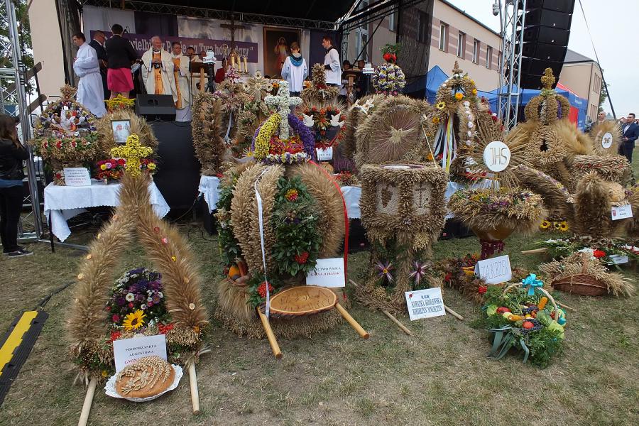 Po eucharystii odbyło się też uroczyste dzielenie chlebem. W tym roku starostami dożynek byli Kazimierz Adamczyk, który prowadzi 36 hektarowe gospodarstwo w Kłonówku specjalizujące się w produkcji mleka oraz Agnieszka Żaczek, która wspólnie z mężem prowadzi 13 hektarowe gospodarstwo w Wojsławicach.