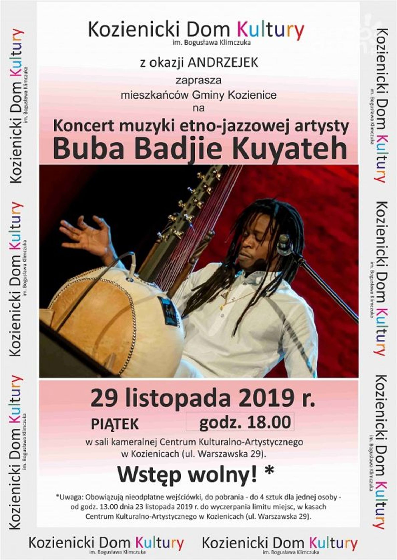 Uwaga: Obowiązują nieodpłatne wejściówki, do pobrania - do 4 sztuk dla jednej osoby - od godz. 13.00 dnia 23 listopada 2019 r. do wyczerpania limitu miejsc, w kasach Centrum Kulturalno-Artystycznego w Kozienicach (ul. Warszawska 29).