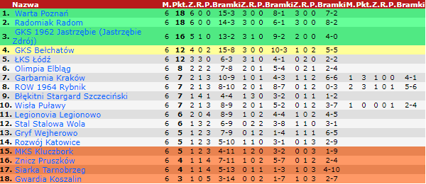 Radomiak Radom od początku sezonu nie zwalnia tempa. „Zieloni” wygrali sześć kolejnych spotkań, a mimo to nie są liderami ligi. To za sprawą równie udanego początku rozgrywek w wykonaniu zawodników Warty Poznań. Piłkarze ze stolicy Wielkopolski nie tylko wygrali wszystkie mecze w tym sezonie ligowym, ale strzelili także jedną bramkę więcej od podopiecznych Jerzego Cyraka. Przed szóstą serią gier ta różnica wynosiła cztery trafień na korzyść Warty, ale wysokie zwycięstwo 4:1 Radomiaka nad Gwardią i skromna wygrana Warty na wyjeździe z Gryfem Wejherowo 1:0 sprawiły, że różnica „stopniała” do jednej bramki. Gol stracony w meczu z Gwardią nie miał większego znaczenia, bo przed tą kolejką „Zieloni” mieli jedną bramkę straconą mniej niż lider z Poznania. (Więcej o meczu z Gwardią (TUTAJ).