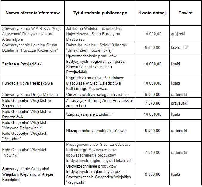Lista dofinansowanych projektów w obszarze „Kultura, sztuka, ochrona dóbr kultury i dziedzictwa narodowego” zadanie 15. Propagowanie idei Sieci Dziedzictwa Kulinarnego Mazowsze oraz upowszechnienie produktów tradycyjnych, regionalnych i lokalnych.