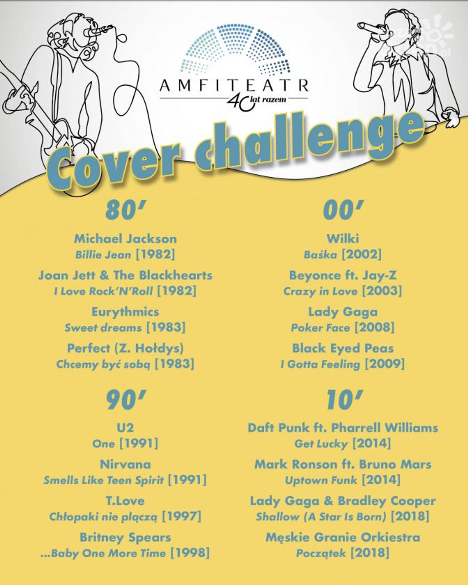 Regulamin konkursu „Cover challenge”, formularz zgłoszeniowy i lista 16 utworów z czterech dekad (obowiązkowa) na stronie www.amfiteatr.radom.pl.