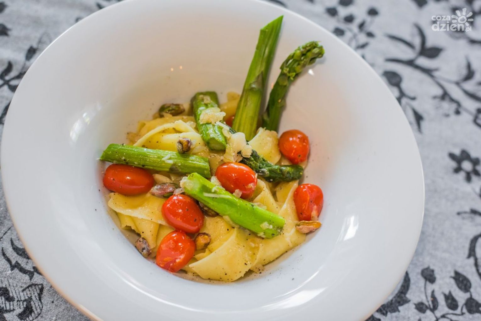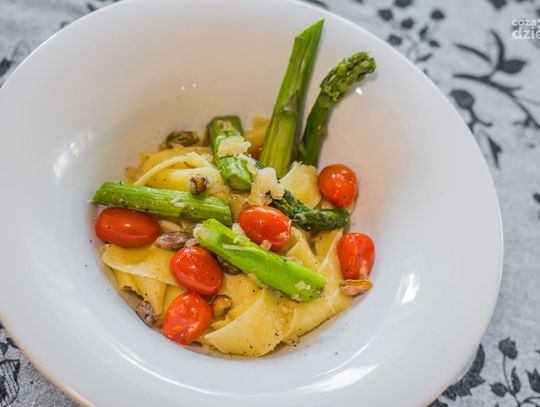Makaron Papardelle ze Szparagami Pomidorkami Chery i Pistacjami