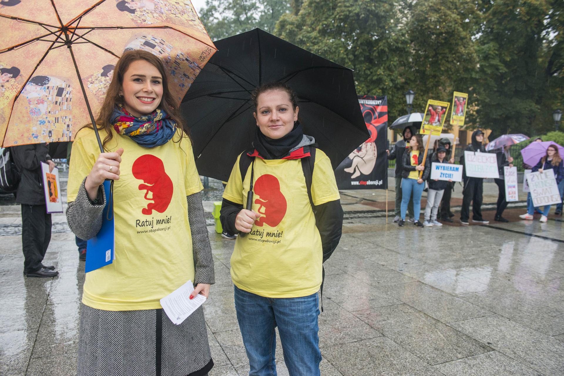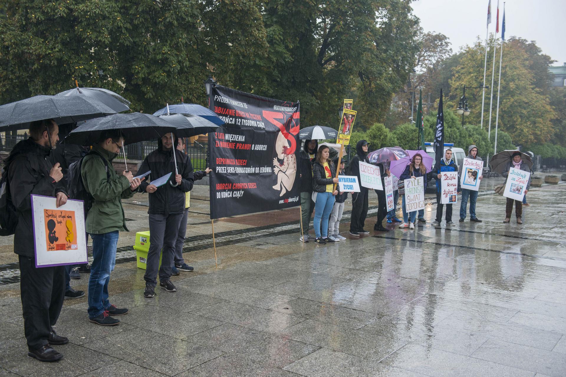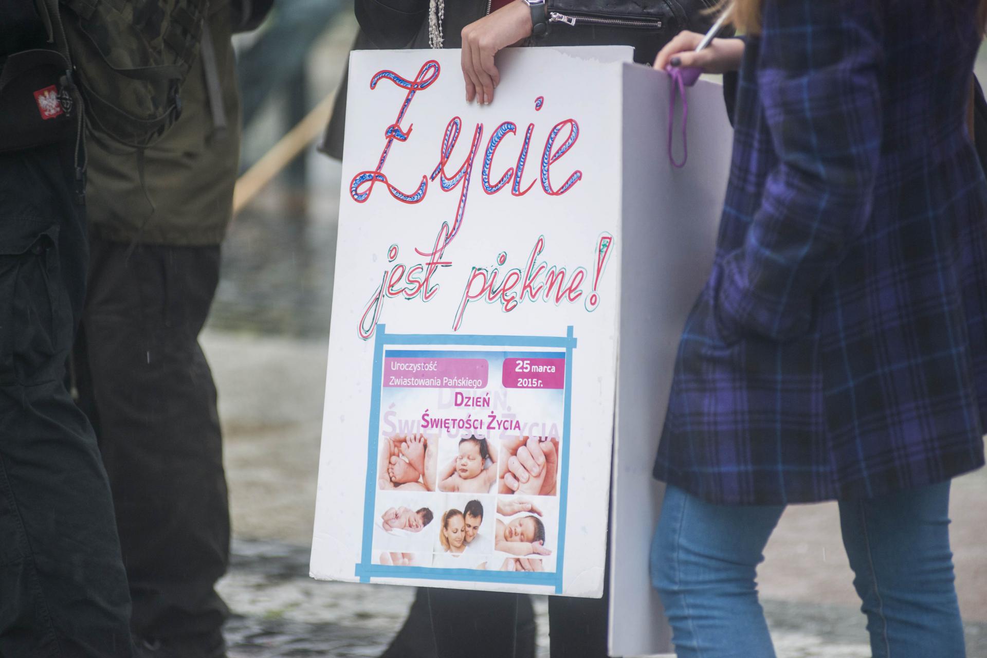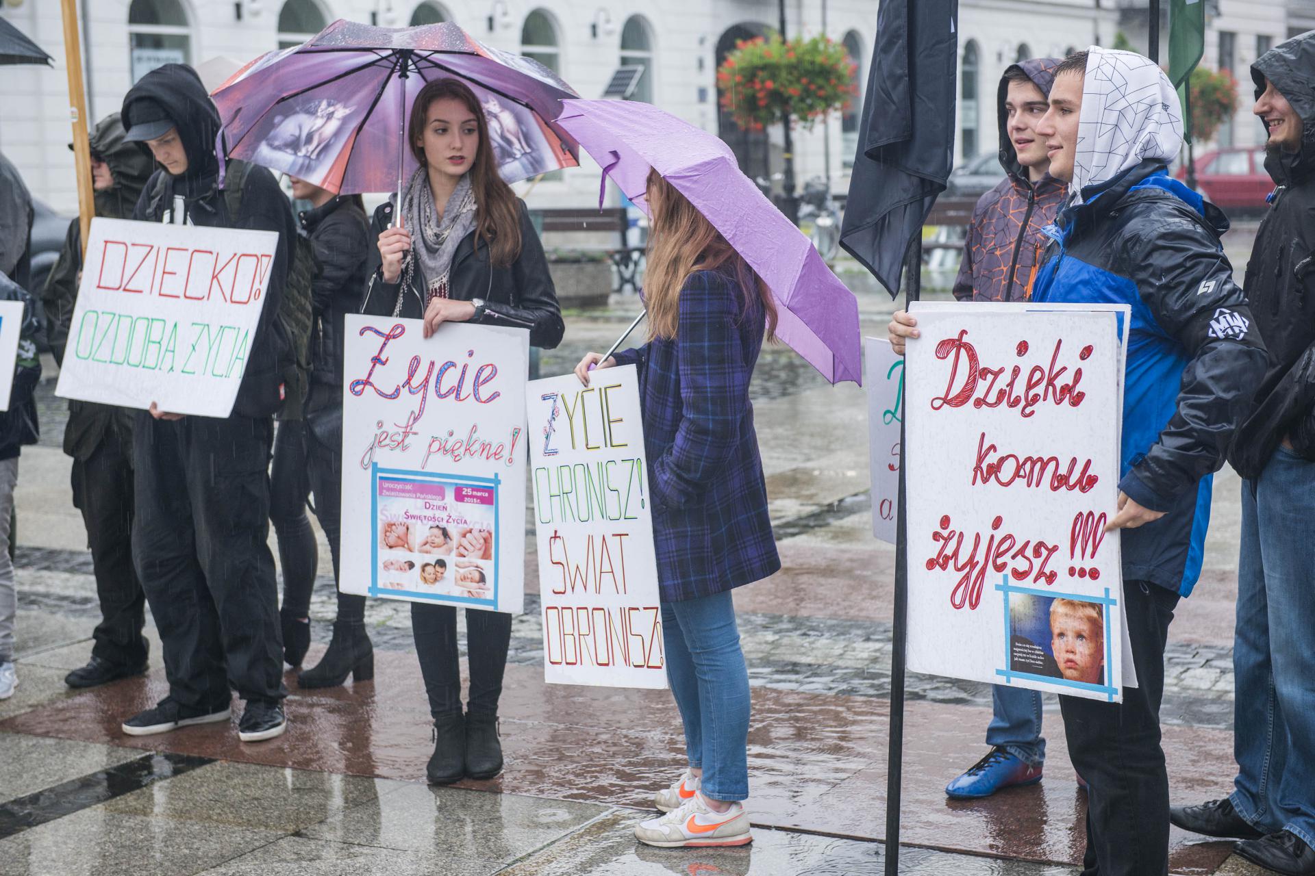 Mniej liczna kontrmanifestacja odbyła się kilkadziesiąt metrów dalej na placu Jagiellońskim. Jak informuje koordynatorka Fundacji Pro – prawo do życia Irmina Boniecka jest to odpowiedź na organizowany przez feministki protest z okazji czarnego wtorku i zbiórki podpisów pod wprowadzającym w błąd projektem ustawy „Ratujmy kobiety”. - W tym projekcie nie ma mowy o ratowaniu kobiet, jest za to mowa o wielu innych kwestiach, o których chcemy uświadomić osoby nie mają na ten temat wiedzy. W tej ustawie feministki chcą prawa do zabijania bez powodu dzieci do 12 tygodnia ciąży. Przy okazji dzisiejszej manifestacji zbieramy również podpisy przeciwko aborcji eugenicznej, która jest niczym innym jak zabijaniem dzieci chorych – powiedziała Boniecka. Według przedstawicieli fundacji proponowane przez inicjatywę kobiecą zmiany mogą spowodować kolejne zmiany prawne i doprowadzić do zwiększenia liczby aborcji wśród młodocianych lub w przyszłości do zalegalizowania eutanazji.