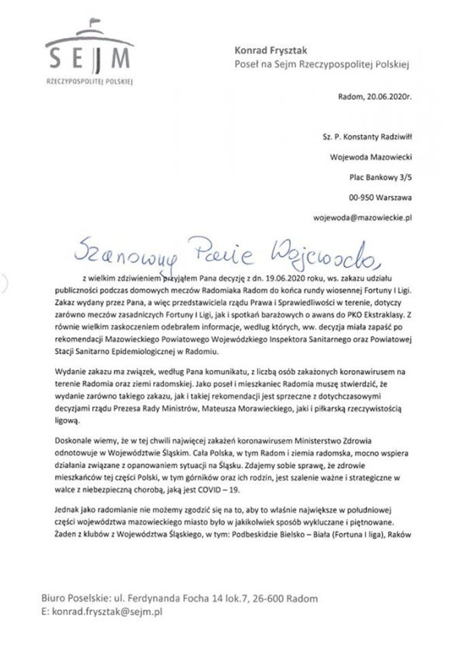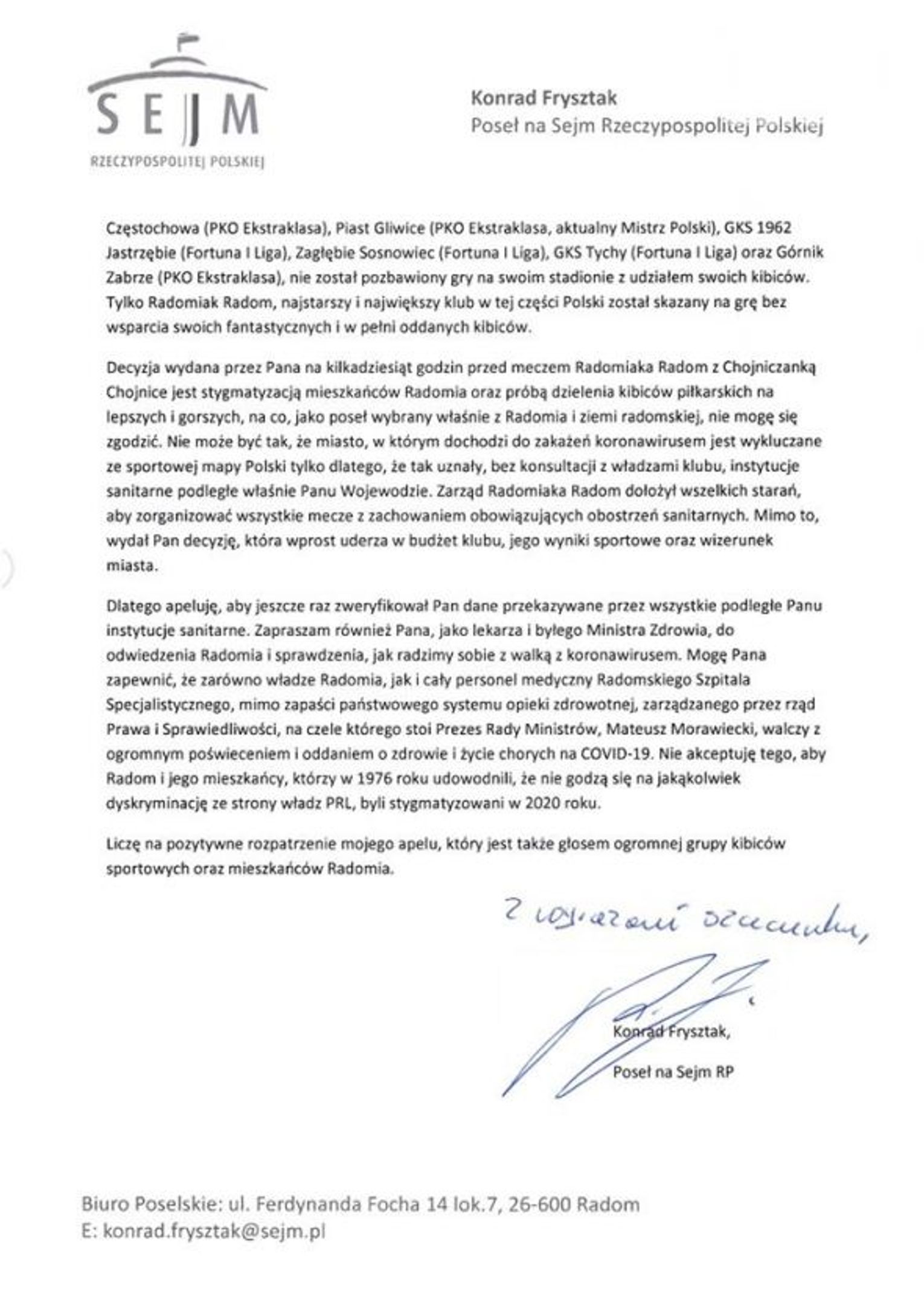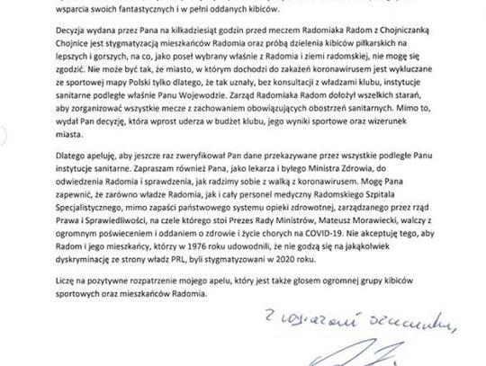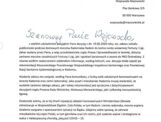 "Jako poseł i mieszkaniec Radomia muszę stwierdzić, że wydanie zarówno takiego zakazu, jak i takiej rekomendacji jest sprzeczne z dotychczasowymi decyzjami rządu Prezesa Rady Ministrów, Mateusza Morawieckiego, jak i piłkarską rzeczywistością ligową. Doskonale wiemy, że w tej chwili najwięcej zakażeń koronawirusem Ministerstwo Zdrowia odnotowuje w województwie śląskim. Zdajemy sobie sprawę, że zdrowie mieszkańców tej części Polski, w tym górników oraz ich rodzin jest szalenie ważne i strategiczne w walce z niebezpieczną chorobą, jaką jest COVID-19. Jednak jako radomianie nie możemy zgodzić się na to, aby to właśnie największe w południowej części województwa mazowieckiego miasto było w jakikolwiek sposób wykluczane i piętnowane"