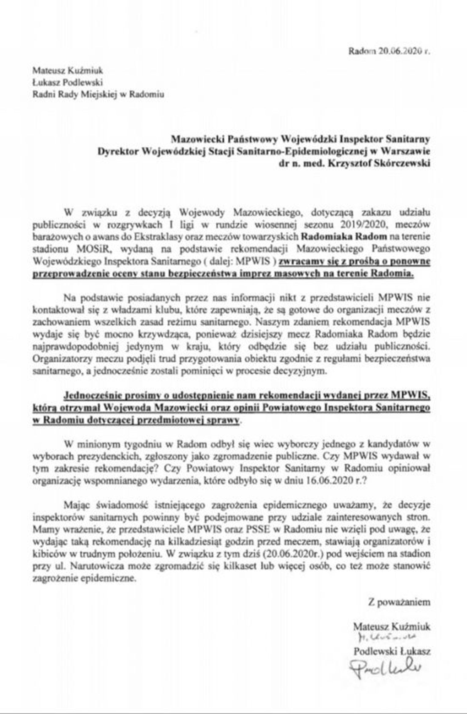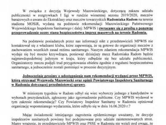"Zwracamy się z prośbą o ponowne przeprowadzenie oceny stanu bezpieczeństwa imprez masowych na terenie Radomia. Na podstawie posiadanych przez nas informacji nikt z przedstawicieli WPWiS nie kontaktował się z władzami klubu, które zapewniają, że są gotowe do organizacji meczów z zachowaniem wszelkich zasad reżimu sanitarnego. Naszym zdaniem rekomendacja MPWiS wydaje się być bardzo krzywdząca. (...) Organizatorzy meczu podjęli trud przygotowania obiektu zgodnie z regułami bezpieczeństwa sanitarnego, a jednocześnie zostali pominięci w procesie decyzyjnym" - piszą Łukasz Podlewski i Mateusz Kuźmiuk.