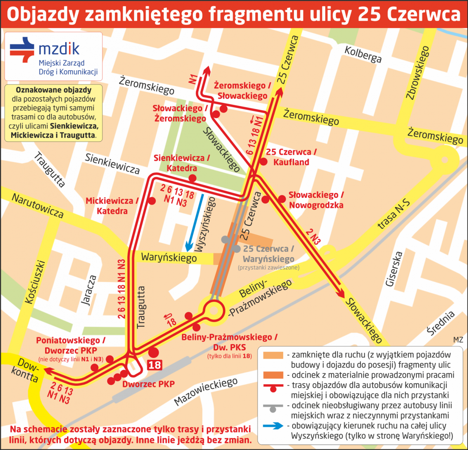 Dla autobusów miejskich linii 2, 6, 13, 18, N1 i N3 będą do odwołania utrzymane dotychczasowe objazdy. Linie 2, 6, 13 - w obu kierunkach: 25 Czerwca, Sienkiewicza, Mickiewicza, Traugutta, Poniatowskiego (powrót przez plac Dworcowy). Linia 18 - w kierunku Nowej Woli Gołębiowskiej: Beliny-Prażmowskiego, rondo Mikołajczyka (zawracanie), Beliny-Prażmowskiego, Traugutta, Mickiewicza, Sienkiewicza, 25 Czerwca; w kierunku pętli Dworzec PKP (powrót z Nowej Woli Gołębiowskiej): 25 Czerwca, Sienkiewicza, Mickiewicza, Traugutta, Beliny-Prażmowskiego. Linie N1, N3 - w obu kierunkach: 25 Czerwca, Sienkiewicza, Mickiewicza, Traugutta, plac Dworcowy (punkt przesiadkowy). Na trasach powyższych objazdów obowiązują stałe przystanki Sienkiewicza / Katedra 03 i Mickiewicza / Katedra 02. Zawieszone jest funkcjonowanie przystanków 25 Czerwca / Waryńskiego 01 i 02. Przystanki Beliny-Prażmowskiego / Dw. PKS 01 i 04 funkcjonują wyłącznie dla linii 18 w stronę Nowej Woli Gołębiowskiej!