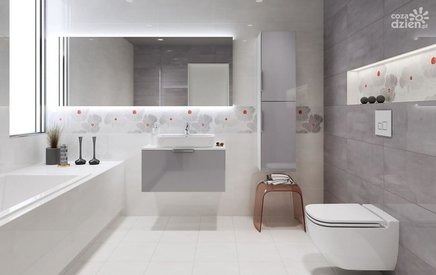 Romantyczny klimat możemy stworzyć, wykorzystując również typowo jasne kolory. Dobrym wyborem będzie beż lub écru. Wybieramy płytki w tym kolorze i układamy je na ścianie. Na podłodze mogą się pojawić płytki inspirowane szlachetnym marmurem z wyraźnie zaznaczonym żyłkowaniem. Kamień niech będzie widoczny też na blacie pod okrągłą umywalką, przy której stanęła sztorcowa złota bateria i akcesoria łazienkowe ze złotym wykończeniem. Blask pojawia się też na oprawie lustra oraz w małych akcentach na ścianie, jak uchwyt na papier toaletowy i wieszaki. Do przechowywania kosmetyków wykorzystujemy koszyki wiklinowe, które zostały wypełnione beżowym materiałem w drobne kwiatki. Ten florystyczny wzór wykorzystajmy też na ręcznikach i dywaniku przy wannie.