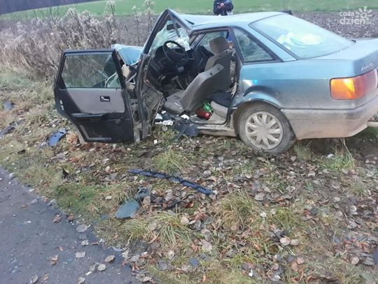 Do czołowego zderzenia toyoty z audi doszło we wtorek, 24 listopada ok. godz. 6.30. Kierowca i pasażer audi trafili do szpitala. Policja bada okoliczności wypadku.