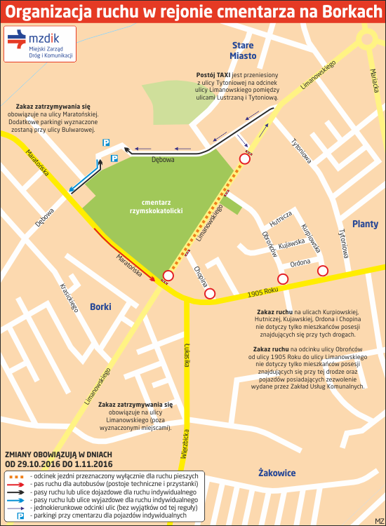 Autobusy linii 1, 16 i 17 będą w dniach 29.10-1.11.2016 kursować objazdami z powodu zamknięcia fragmentu ulicy Limanowskiego wzdłuż cmentarza - w obydwu kierunkach ulicami Tytoniową oraz 1905 Roku. Na trasie objazdu będą obowiązywały przystanki: 1905 Roku / Tytoniowa 03, 1905 Roku / Obrońców 05 i 06. Uruchomione będą przystanki dodatkowe: Tytoniowa / Limanowskiego 01 i 02 (w obu kierunkach) oraz Tytoniowa / 1905 Roku 04 (w stronę Borek).