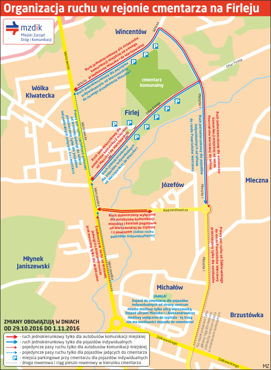 - linia 13: w dniach 29-31.10 i 2.11.2016 ulicami Mieszka I, Aleksandrowicza, zawracanie na pętli Józefów / Szpital,