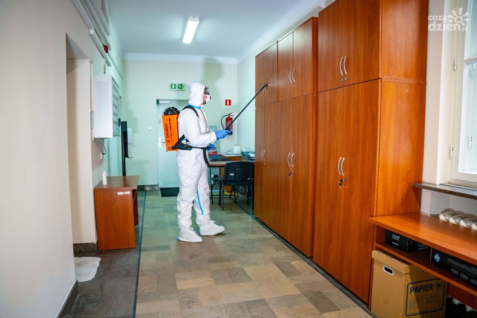 Dekontaminacja została przeprowadzona na powierzchni 600 m2, czyli na parterze budynku. Procesowi odkażania zostały poddane korytarze, pomieszczenia, ramy, klamki i najczęściej dotykane przez interesantów przedmioty.