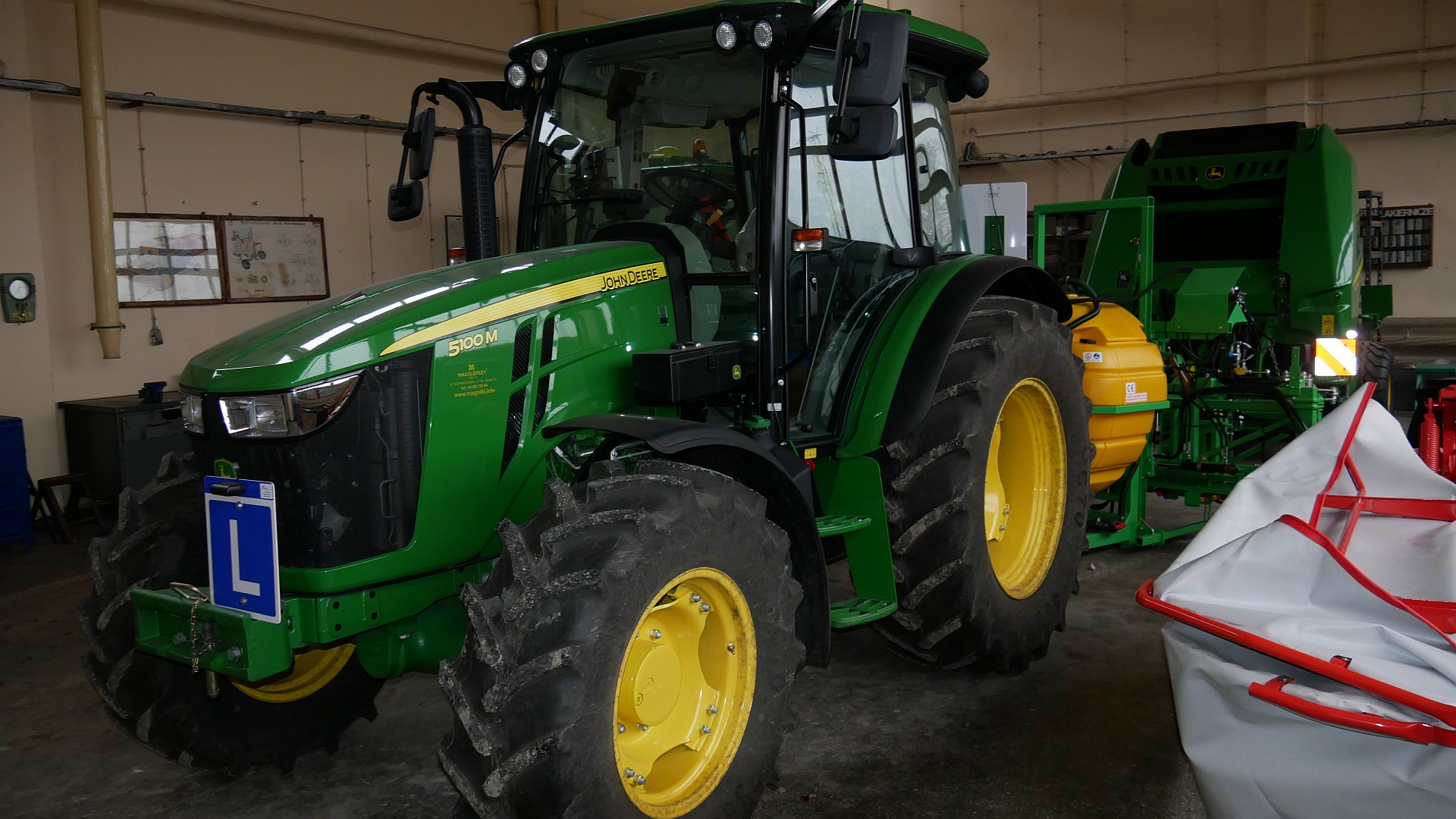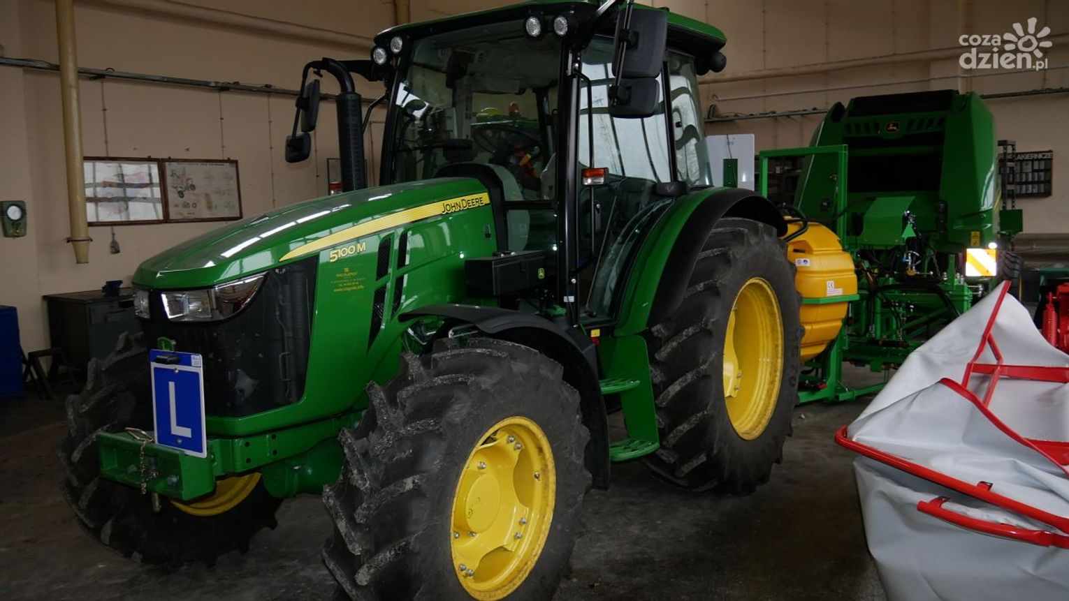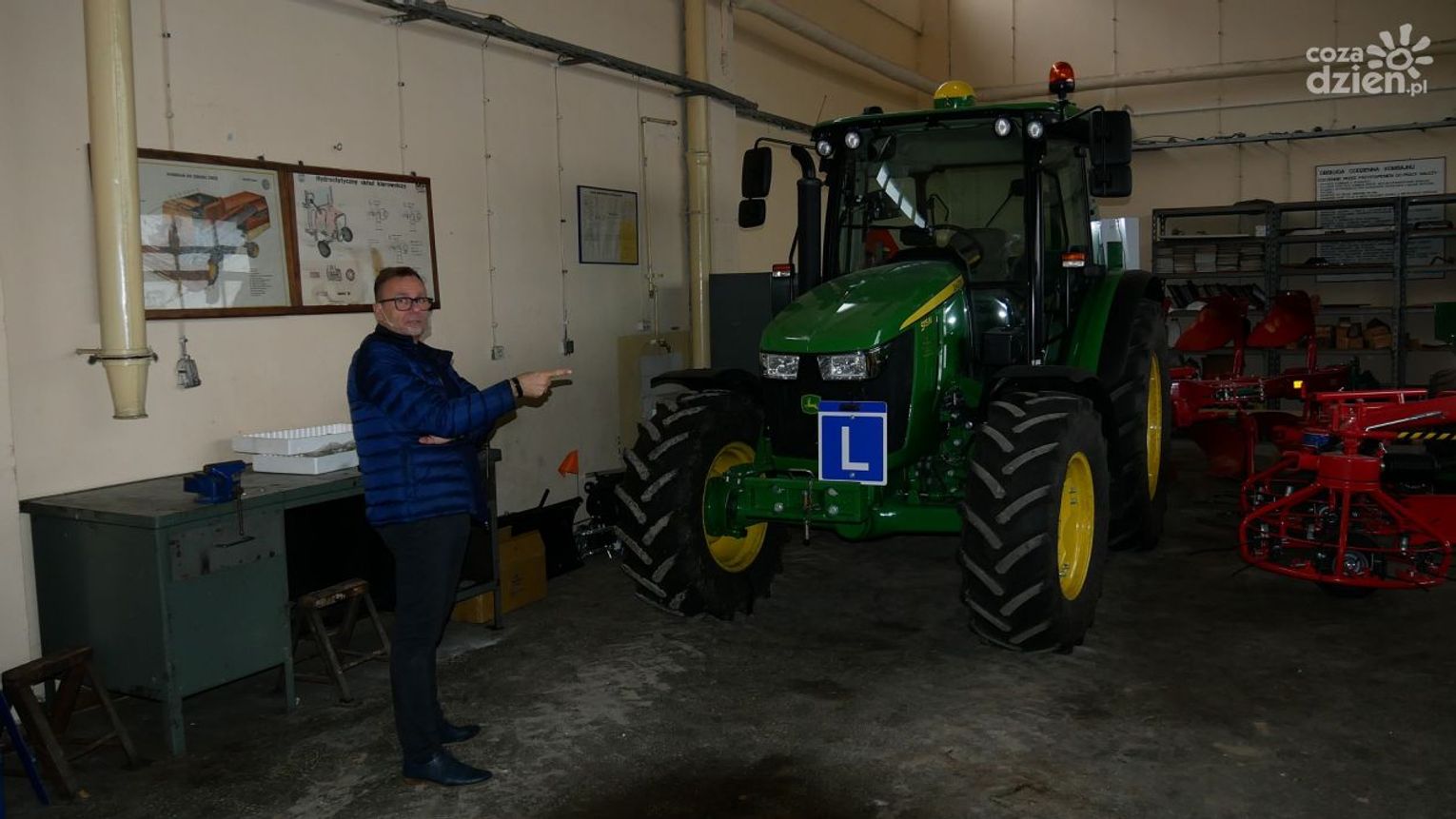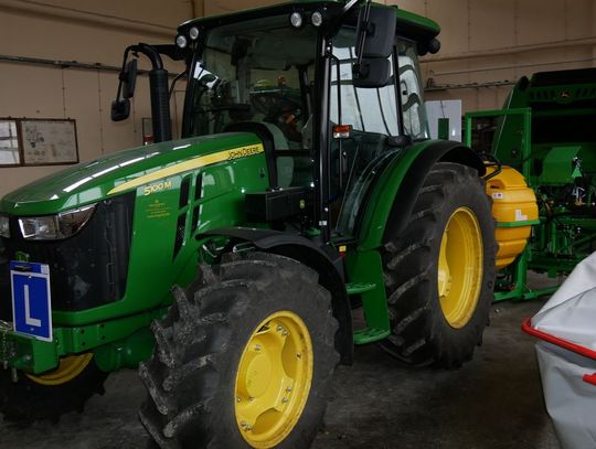 2 ciągniki z napędem na 4 koła, przystosowane do nauki jazdy marki John Deere, wyposażone w systemy nawigacji satelitarnej i precyzyjnego prowadzenia,