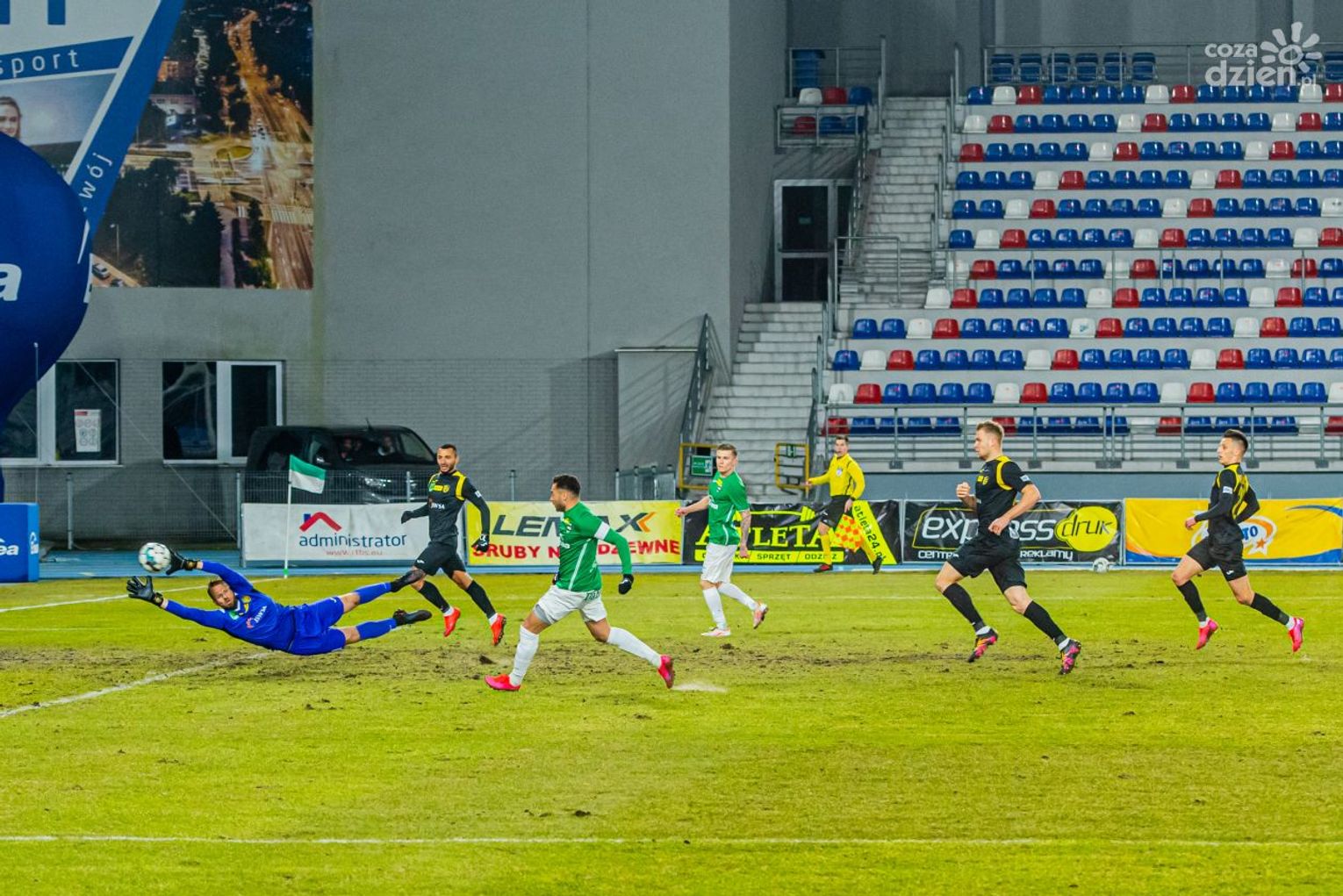 Tymczasem mecz rozpoczął się od skomasowanych ataków „Zielonych”. Ci w porównaniu do meczu z Chrobrym zagrali bez kontuzjowanego Mateusza Radeckiego. Pomocnika zastąpił Meik Karwot, ale to nie on był bohaterem pierwszej połowy.