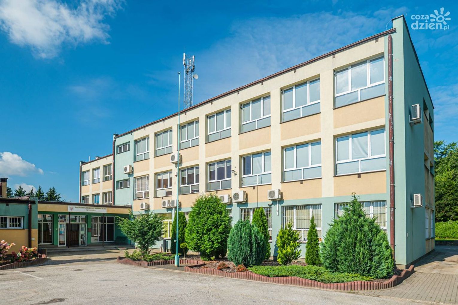 Budynek podstawówki jest trzykondygnacyjny. „Dzięki udziałowi w 3 edycjach Budżetu Obywatelskiego i ogromnemu zaangażowaniu całej szkolnej społeczności udało nam się dobudować łącznik, który połączył szkołę ze stołówką oraz wybudować drogę dojazdową (edycja 2015), zbudować boisko wielofunkcyjne z nawierzchni poliuretanowej wraz z bieżnią (edycja 2016) oraz siłownię zewnętrzną (edycja 2017)” - piszą autorzy historii szkoły.