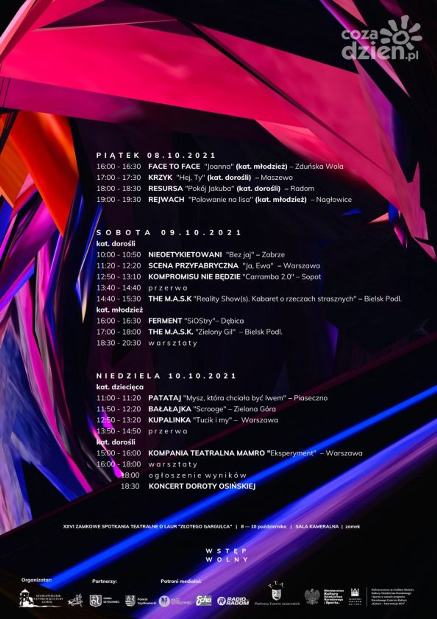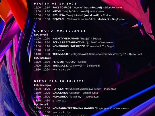 Podczas tegorocznego przeglądu teatrów amatorskich zaprezentują się nie tylko grupy dziecięce i młodzieżowe, jak miało to miejsce do tej pory. Szydłowieckie Centrum Kultury Zamek postanowiło otworzyć swoją scenę również dla grup dorosłych. W dniach 8-10 października, na zamkowej scenie pojawi się 14 grup z całej Polski. Ich występy oceniać będzie jury w składzie Tomas Kollarik i Kamil Błoch - absolwenci wydziału aktorskiego Państwowej Wyższej Szkoły Teatralnej w Krakowie.