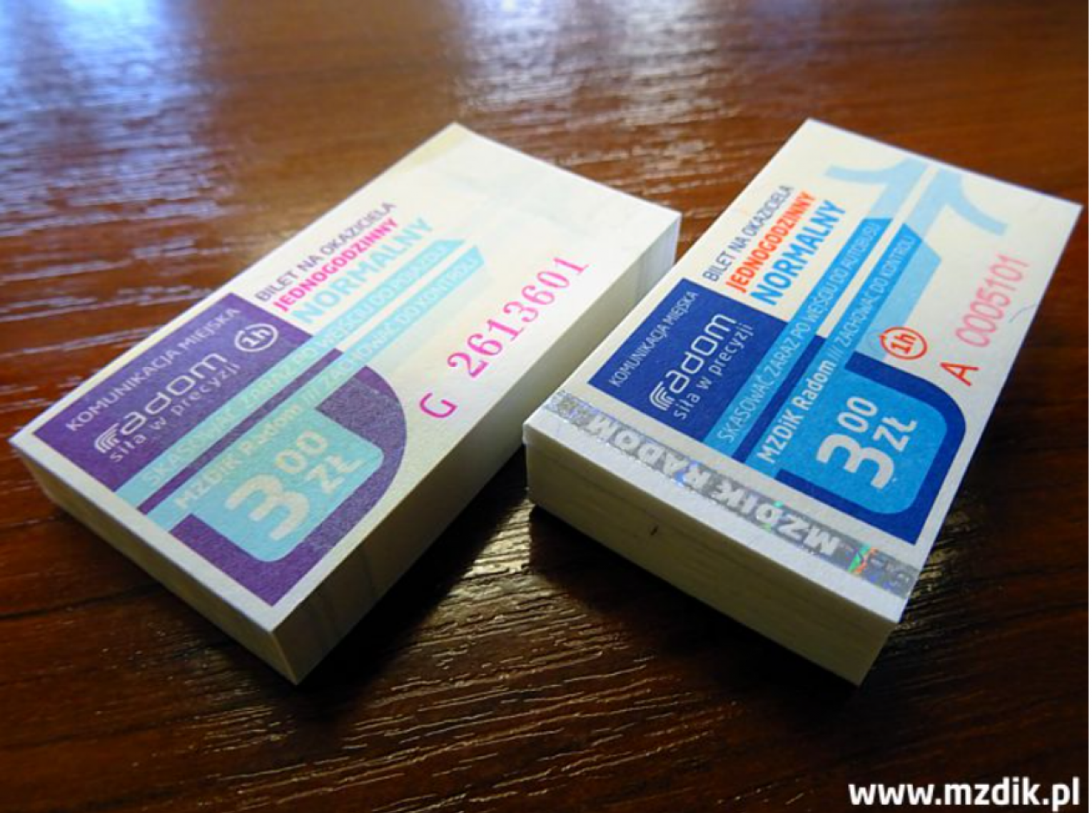 Lekko zmodyfikowany wzór papierowych biletów jednogodzinnych trafił już do sprzedaży. Po lewej stronie każdego takiego biletu jest teraz hologram z napisem MZDiK Radom. Stare wzory obowiązują do wyczerpania dotychczasowych zapasów. Cena pozostała bez zmian. Korekty dotyczą tylko szaty graficznej.