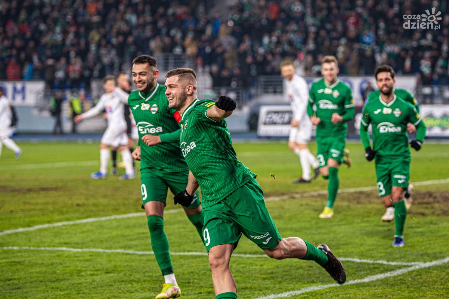 Początek meczu zupełnie tego nie potwierdzał. To gospodarze niesieni dopingiem nadkompletu publiczności zepchnęli rywala do defensywy i co chwila stwarzali zagrożenie pod bramką Filipa Bednarka. Napór Zielonych przyniósł spodziewany efekt w 16 minucie. Wtedy też Dawid Abramowicz dośrodkowywał piłkę w pole karne i tam ręką dotknął ją jeden z defensorów Lecha. Arbiter Jarosław Przybył z Kluczborka kazał kontynuować grę, ale po chwili ją przerwał i podbiegł do telewizora, by jeszcze raz za pomocą systemu VAR ją ocenić. Werdykt był taki, że sędzia podyktował jedenastkę, a pewnym jej egzekutorem okazał się Karol Angielski. Po straconej bramce „Kolejorz” zaczął śmielej atakować, ale nadział się na kontrę. Właśnie w 30 minucie miejscowi wyprowadzili akcję, po której dłonie same składały się do oklasków. Angielski w środku boiska utrzymał się przy futbolówce i po wymanewrowaniu dwóch rywali podał ją do Luisa Machado, a ten przedłużył ją do Abramowicza. Ten znajdując się już w polu karnym wycofał piłkę do Maurdiesa. Brazylijczyk zachował się, jak na napastnika przystało i bez najmniejszych problemów strzelił nie do obrony! Zaledwie kilkadziesiąt sekund później Machado dopadł do dośrodkowanej futbolówki i strzelił z tzw. pierwszej piłki, ale tym razem na posterunku był Bednarek.
