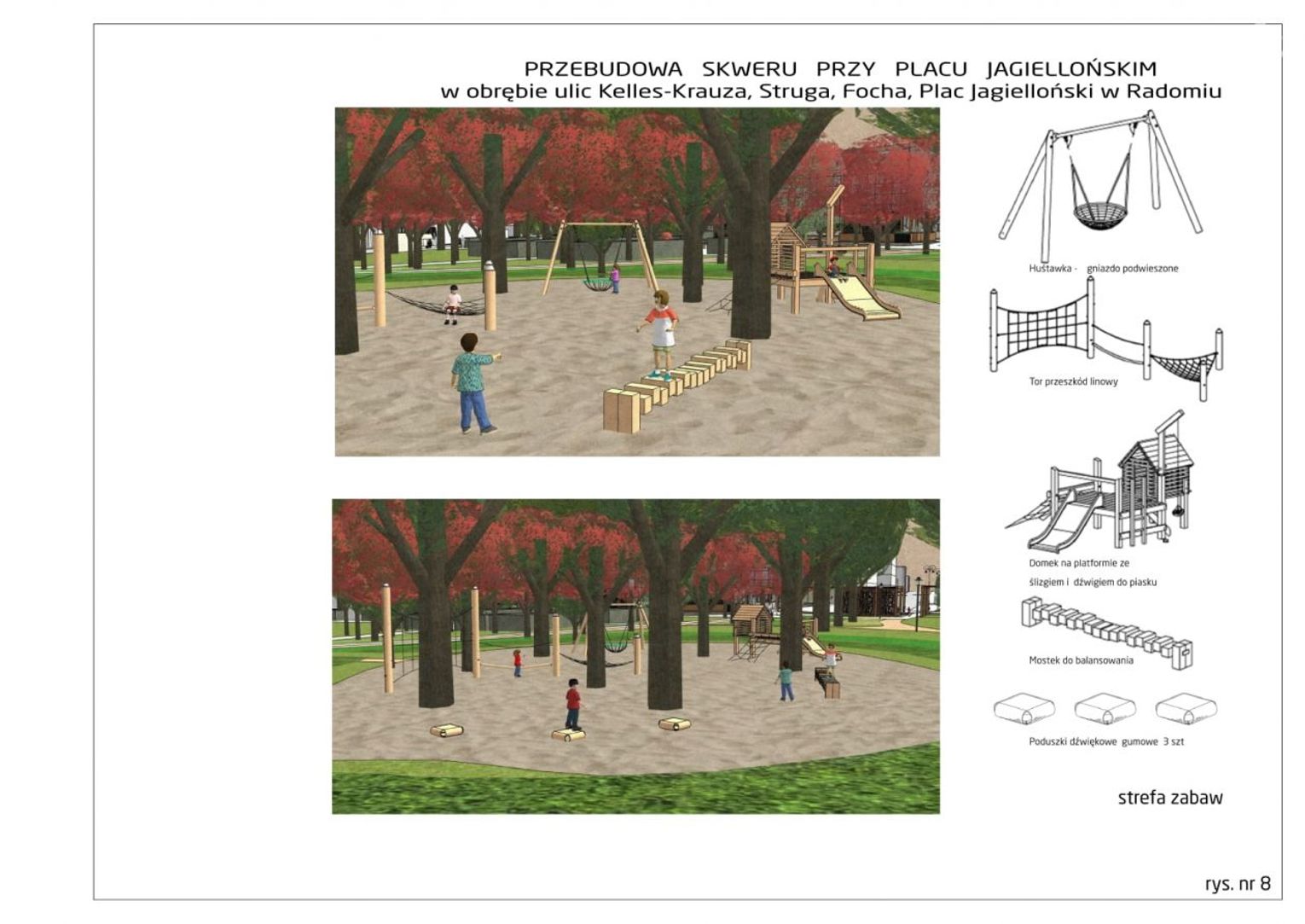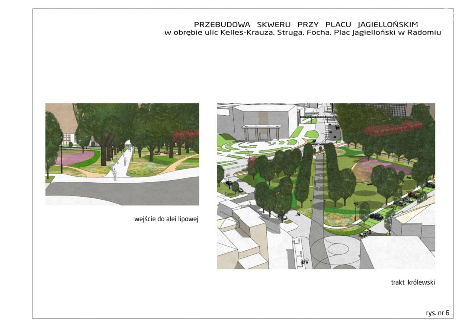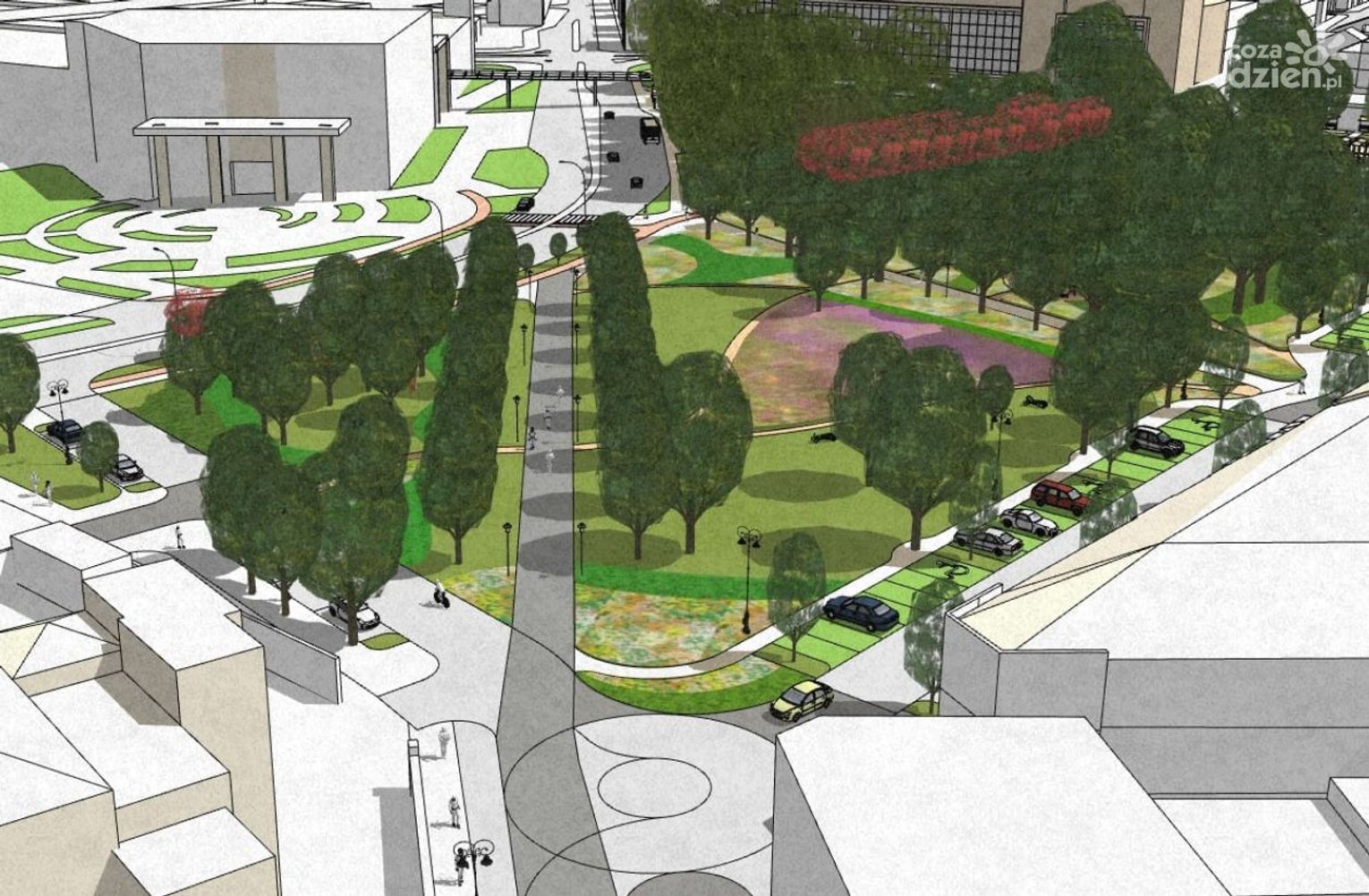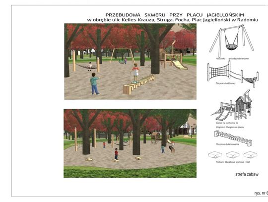 Wykonawca będzie też musiał zaprojektować nowe oświetlenie, a także nowe nasadzenia drzew i krzewów, łąkę kwietną, ogrody deszczowe czy zielone ściany. Według koncepcji ma też powstać konstrukcja pergoli stanowiącej miejsce odpoczynku i integracji. Pojawią się też nowe elementy małej architektury, tj. ławki, ławki bujane, leżaki, hamaki czy altany.