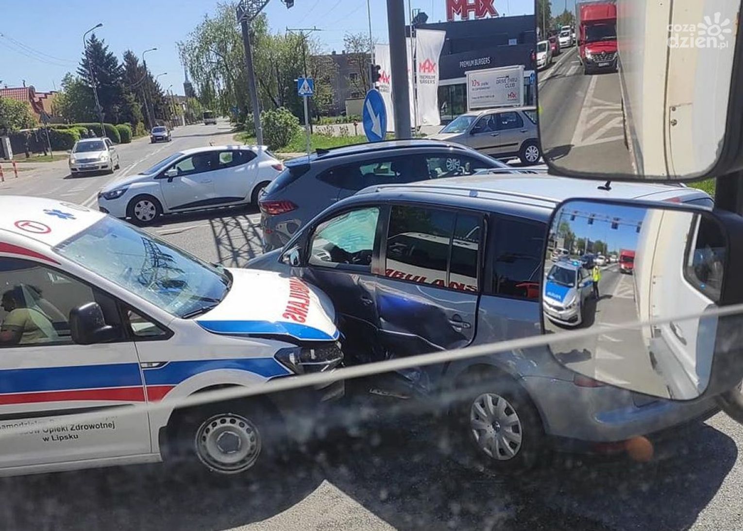 Jak poinformował nas st. sierż. Kamil Warda z KMP w Radomiu, do kolizji doszło ok. g. 13.20. 60-letni mężczyzna, który kierował ambulansem do przewozu krwi - jadąc z włączonymi sygnałami świetlnymi i dźwiękowymi - wjechał na skrzyżowanie na czerwonym świetle, gdzie doszło do zdarzenia z volkswagenem, którym podróżowała 52-letnia kobieta.