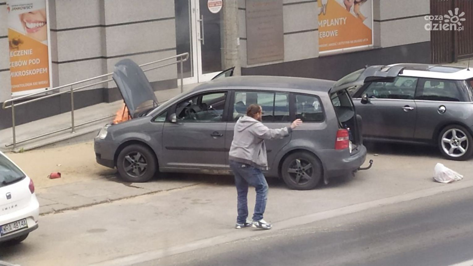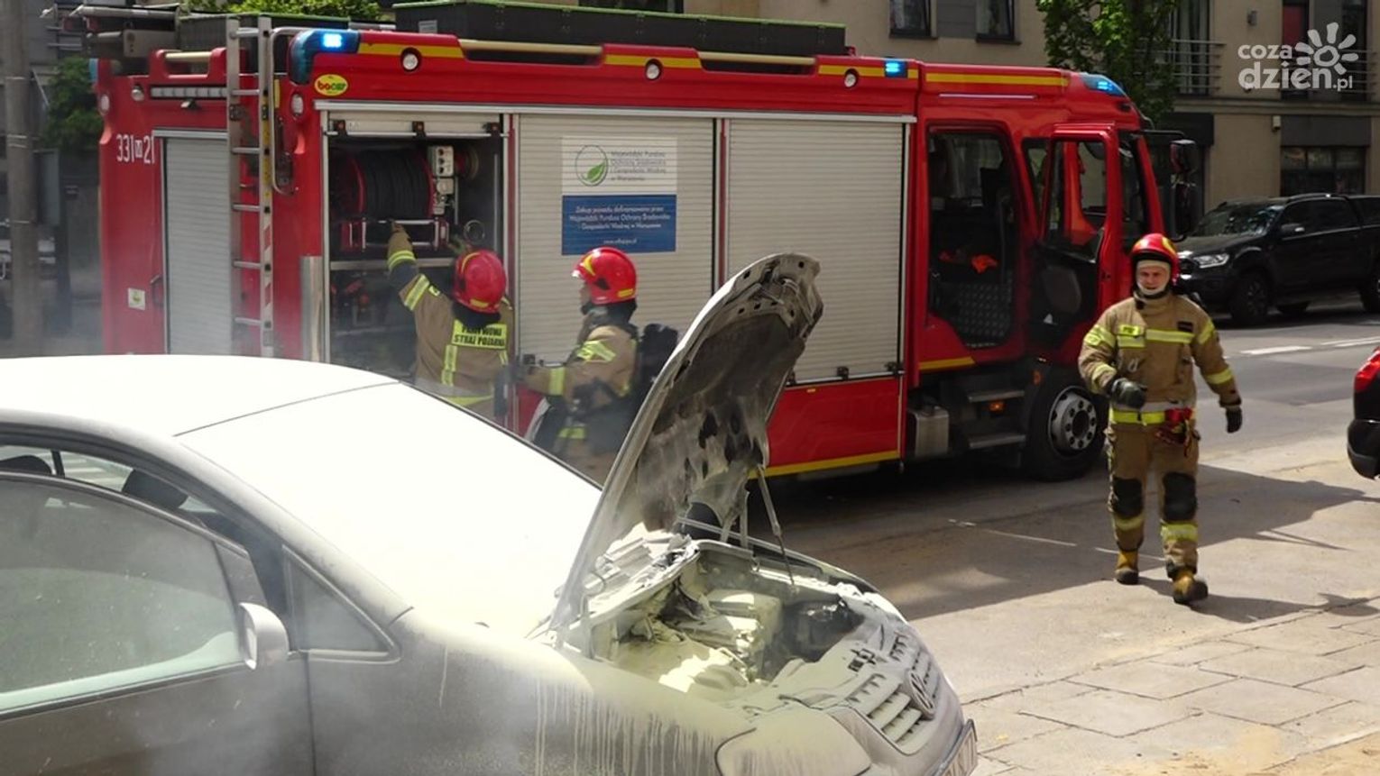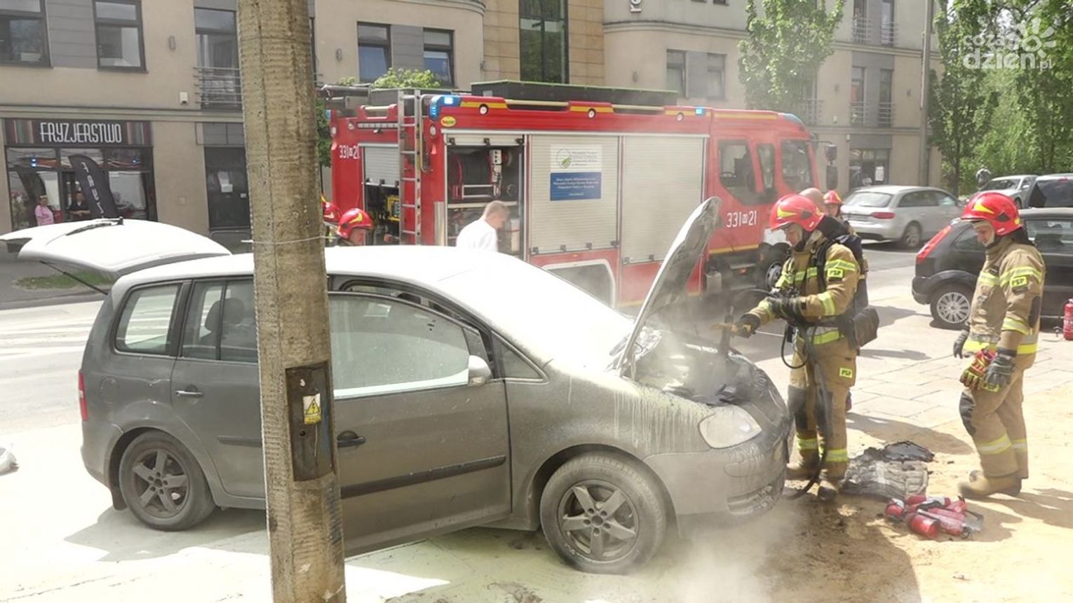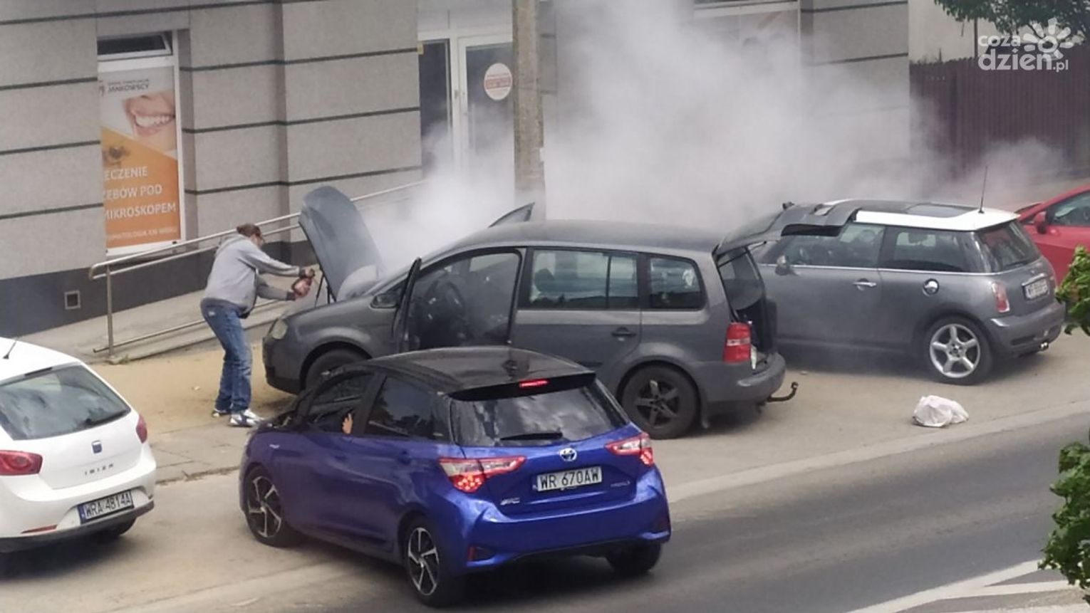 Do zdarzenia doszło w czwartek, 12 maja przed godz. 13 na ul. Okulickiego. Kierowca auta osobowego, które się zapaliło, użył samochodowej gaśnicy, ale nie przyniosło to żadnego rezultatu. Kolejno zatrzymywali się inni kierowcy, którzy użyczali swoich gaśnic, ale ogień był bardzo trudny do opanowania. Udział swój mieli także pracownicy okolicznych firm, którzy przybiegli z dużymi gaśnicami. Dopiero wtedy udało się opanować groźnie wyglądającą sytuację.