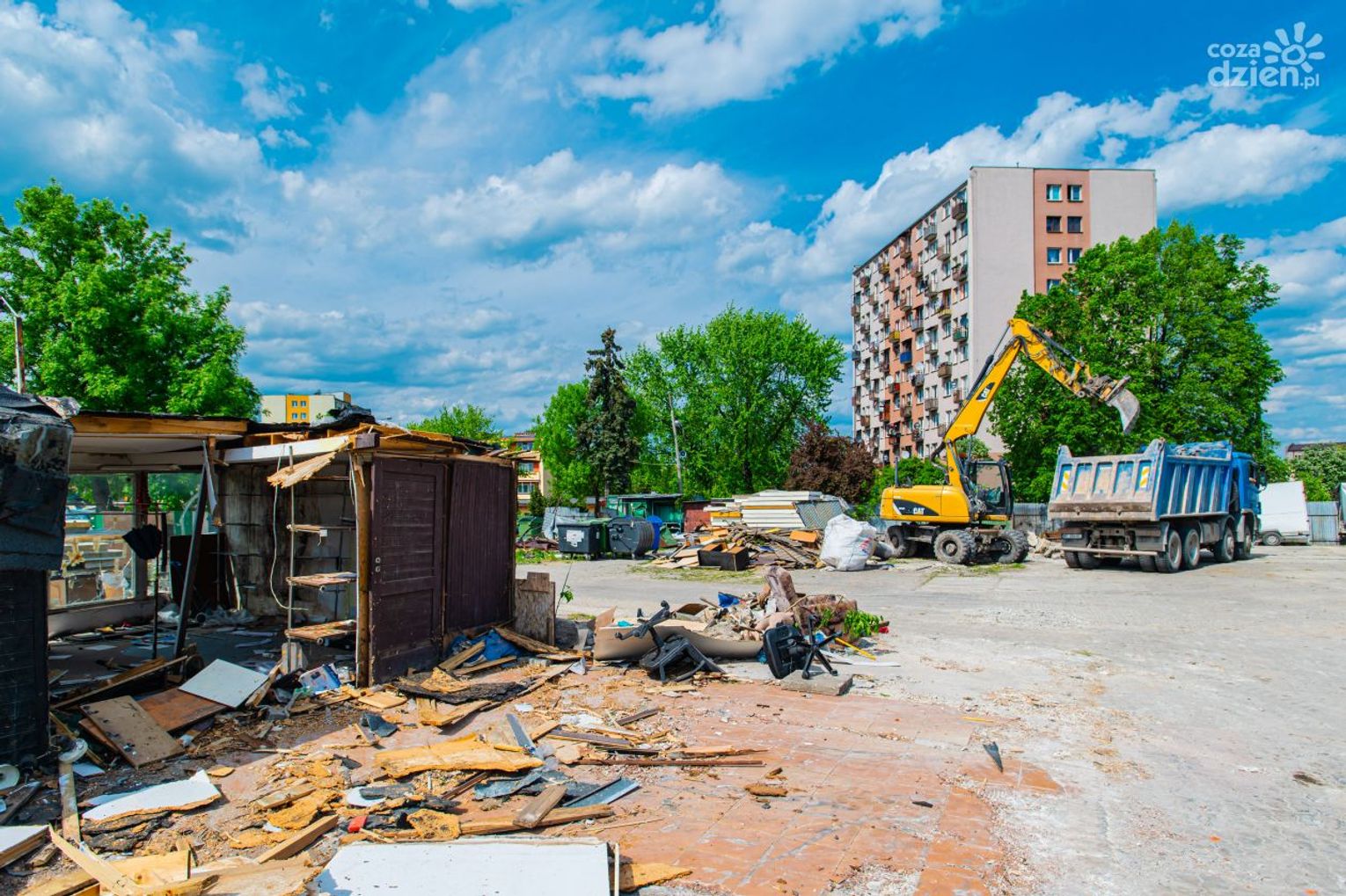 Kilkanaście dni temu handlujący na części targu od strony hali przenieśli się na nieużywany już od kilku lat plac od strony ul. Śląskiej. To, oczywiście, tymczasowe lokum kupców – do czasu zakończenia inwestycji. Potem rozpoczęło się rozbieranie opuszczonych budek i straganów oraz wyburzanie stojących przy ul. Poznańskiej, a więc w środku targowiska, należących wcześniej do prywatnych osób budynków.