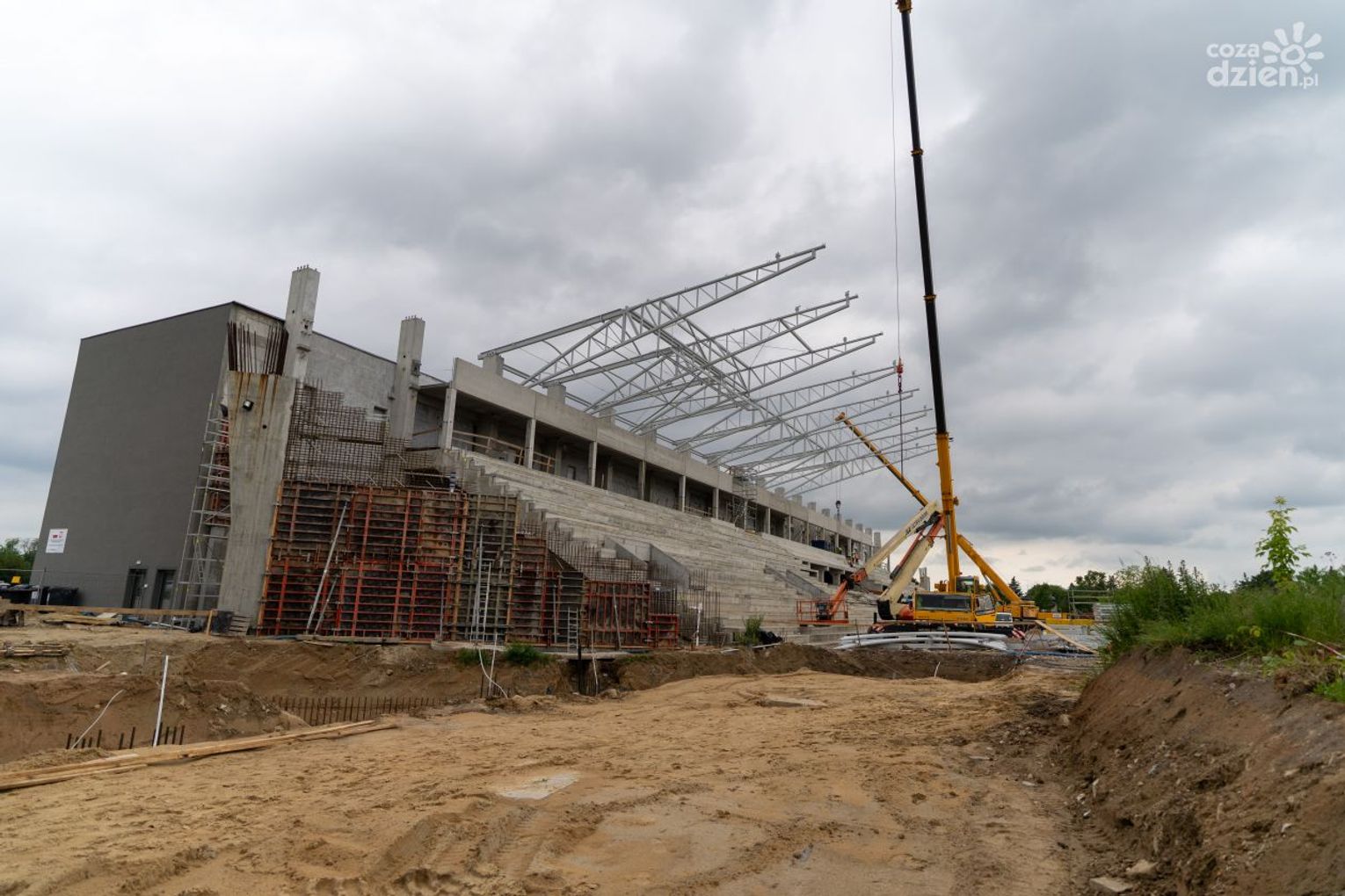 Jak czytamy na profilu MOSiR Radom na Facebooku, na budowie trwa montaż elementów stalowych dachu na trybunie południowej stadionu. Układane są również elementy betonowe. Kontynuowane są prace przy narożnikach trybuny południowej. Rozpoczęły się także prace przygotowawcze przy murawie boiska.