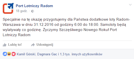 Radom-Warszawa w dniu 31.12.2016 od godziny 6:00 do 18:00. Samoloty