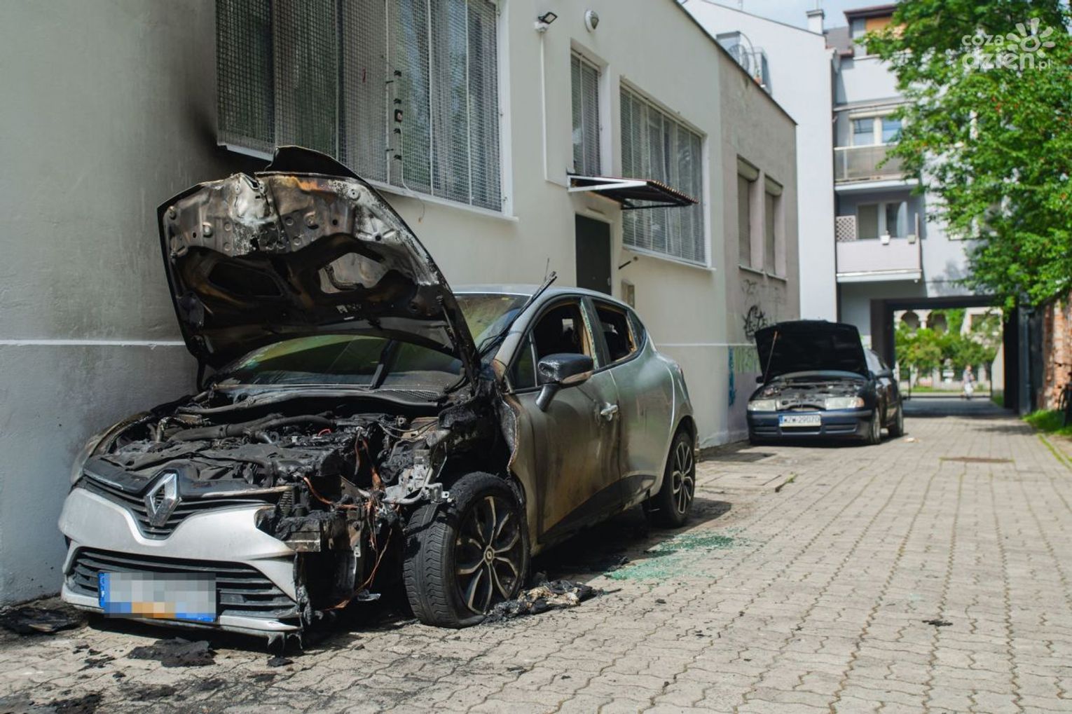 Do pożaru dwóch osobówek doszło dziś (24.08) po północy przy ul. Kelles Krauza 30. To skoda octavia i renault clio.