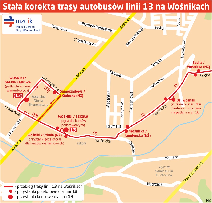 Wybrane kursy linii 13 będą skierowane na trasę wydłużoną, przebiegającą ulicami Wośnicką (bez wjazdu na pętlę Wośniki / Szkoła), Hodowlaną i Samorządową - do przystanku Wośniki / Samorządowa, zlokalizowanego przy firmach działających w strefie ekonomicznej (powrót ulicami Samorządową, Kielecką i Wośnicką).