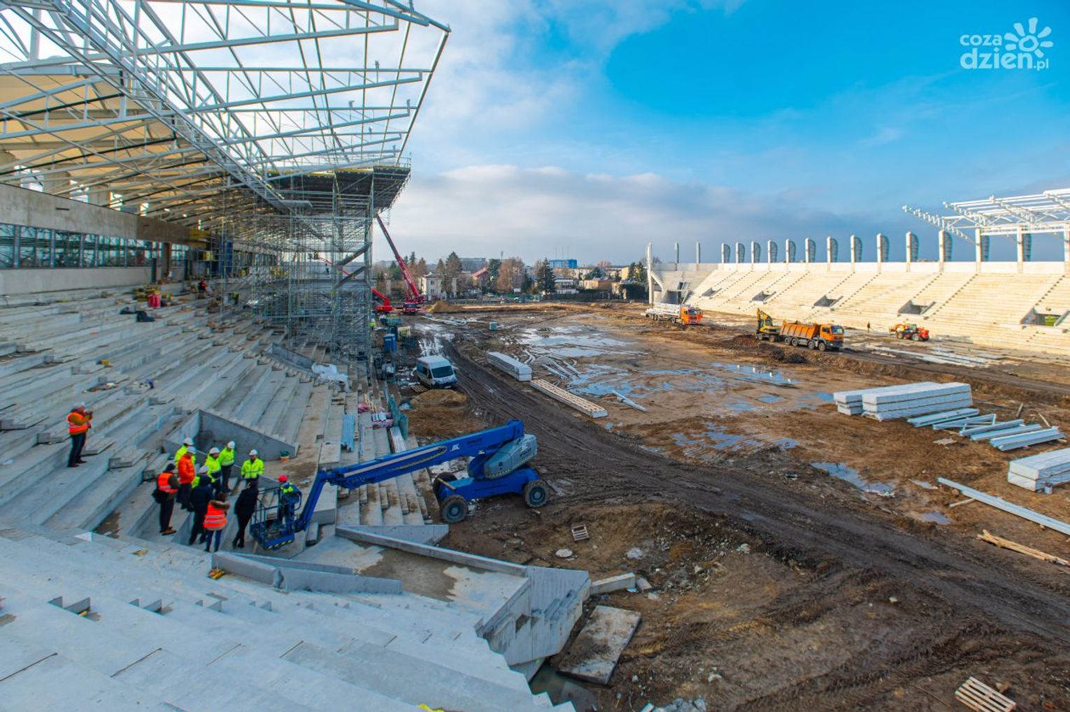 W ostatnich tygodniach prace toczyły się głównie w pomieszczeniach pod trybunami. Teraz budowa przeniosła się na zewnątrz i z każdym dniem widać coraz większe zaawansowanie przy konstrukcji dachu.