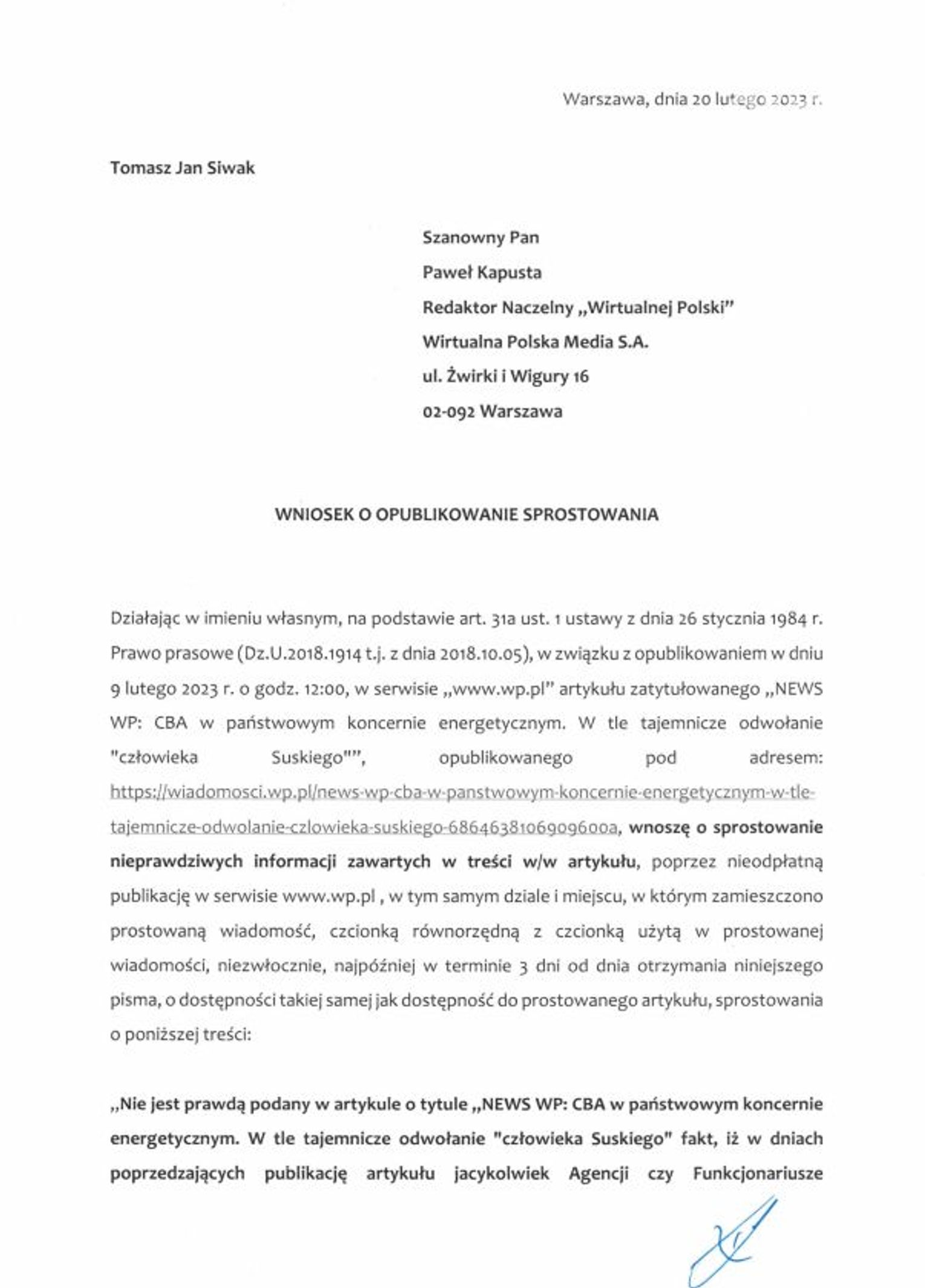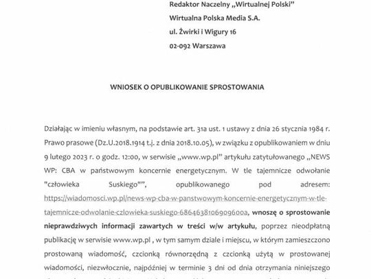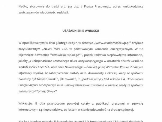 Do naszej redakcji trafiło sprostowanie, adresowane do portalu Wirtualna Polska, w którym Tomasz Siwak odnosi się do opublikowanego niedawno artykułu w sprawie kontroli CBA w spółkach Enea i Enea Nowa Energia.