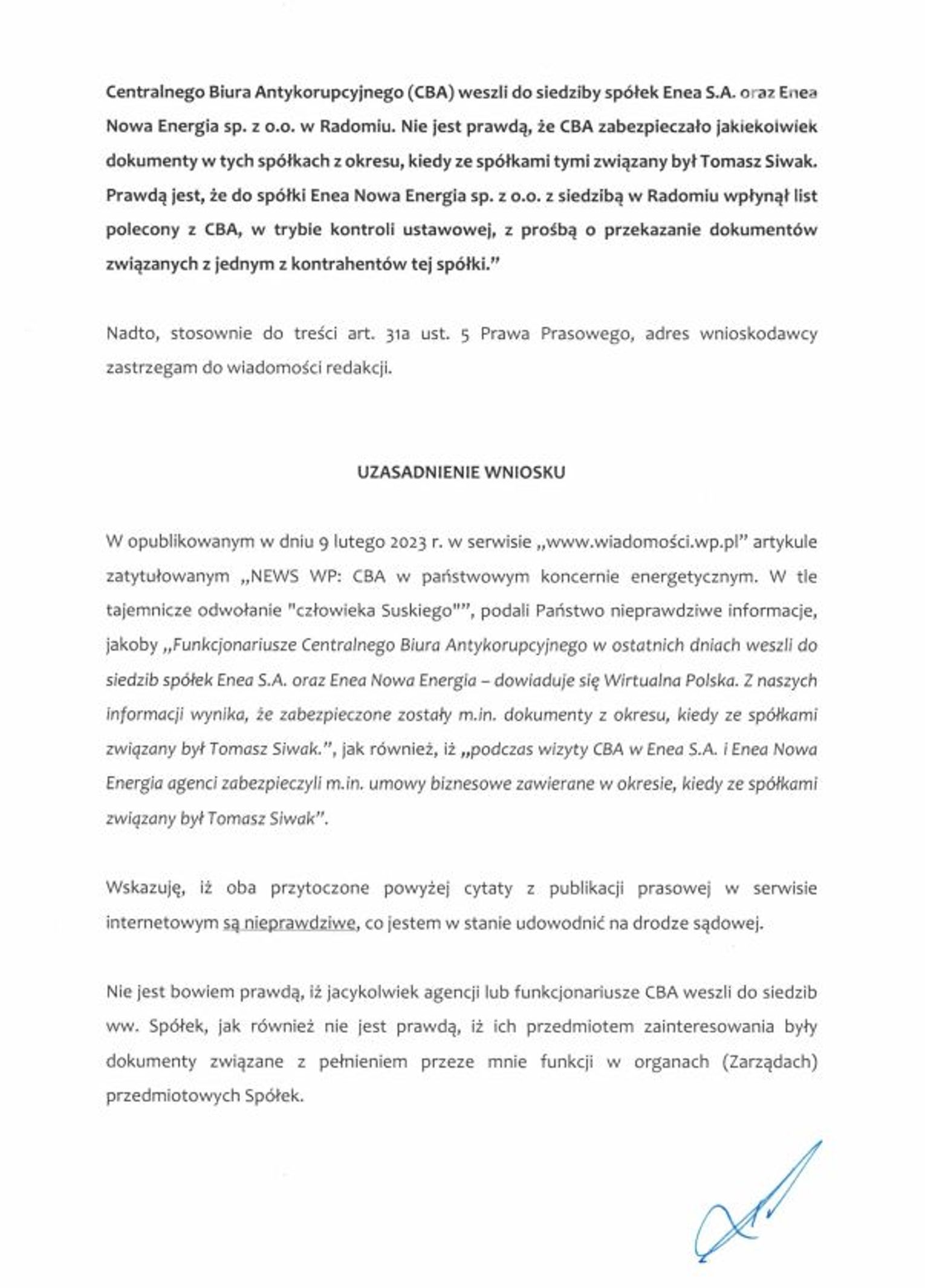- Nie jest prawdą podany w artykule fakt, iż w dniach poprzedzających publikację artykułu jacykolwiek agenci czy funkcjonariusze Centralnego Biura Antykorupcyjnego weszli do siedziby spółek Enea oraz Enea Nowa Energia w Radomiu. Nie jest prawdą, że CBA zabezpieczało jakiekolwiek dokumenty w tych spółkach z okresu, kiedy byłem z nimi związany. Prawdą jest, że do spółki Enea Nowa Energia z siedzibą w Radomiu wpłynął list polecony z CBA, w trybie kontroli ustawowej, z prośbą o przekazanie dokumentów związanych z jednym z kontrahentów tej spółki - pisze Tomasz Siwak. -Przedstawione nieprawdziwe informacje bezpośrednio godzą w moją rzetelność i reputację zawodową, jak również zawierają z gruntu fałszywą próbę powiązania mojego nazwiska i mojej osoby z działaniami rzekomo niezgodnymi z prawem lub co najmniej wątpliwymi. Taki bowiem jest odbiór społeczny stwierdzenia, że do "spółek weszli agenci" i "zabezpieczają dokumenty", co jednoznacznie kojarzy się z działalnością co najmniej niezgodną z prawem - a w przedmiotowej sytuacji, w świetle bezspornych faktów, jest oczywistym kłamstwem - dodaje Siwak.